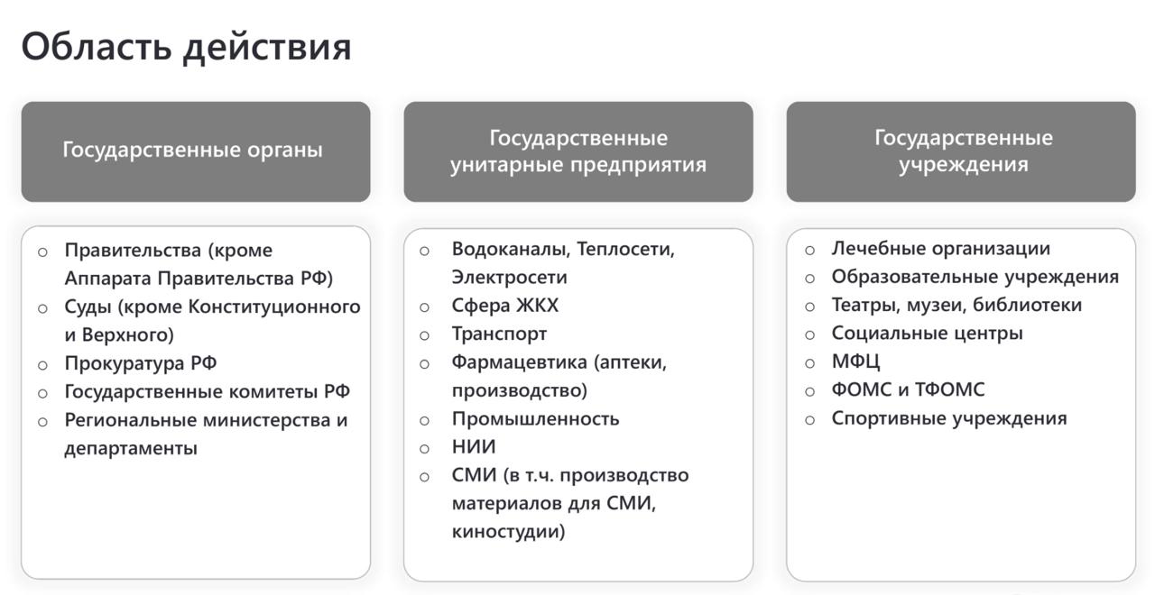 Не менее важно, что приказ распространяется на государственные театры, музеи, образовательные учреждения и лечебные организации. Стоит отметить, что новый приказ охватывает и все муниципальные информационные системы, то есть администрации городов и районов также подпадают под его действие.