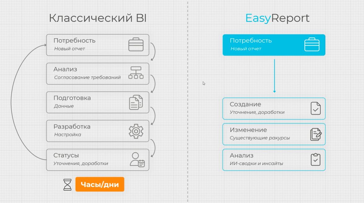 В частности, ИИ не подходит для «точных» задач агрегации. Большие справочники и вычисления остаются за пределами возможностей искусственного интеллекта. Нельзя всю структуру хранилища данных отправить в LLM и надеяться, что она не ошибется на этапе генерации отчета. В то же время ИИ проявляет себя в отношении гибких сценариев общения и снижает барьер входа.