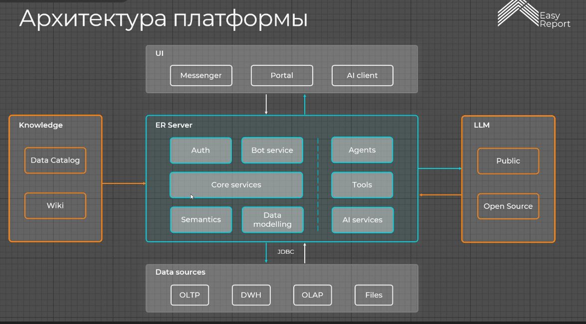 Характеризуя архитектуру решения, эксперт отметил, что Easy Report поддерживает транзакционные системы, любые реляционные базы, для части СУБД предусмотрены драйверы, чтобы не пришлось ничего перегружать. Среда моделирования дополняется бизнес-глоссарием, который предусматривает описательную составляющую – термины, определения, сокращения, аббревиатуры, бизнес-сленг и т. п. Собственная разработка компании – гибридный движок, в нем реализованы механизмы агентной архитектуры с инструментами, к которым можно обращаться по мере необходимости (опционально). Что касается LLM, то можно подключать как публичную, так и Open Source.