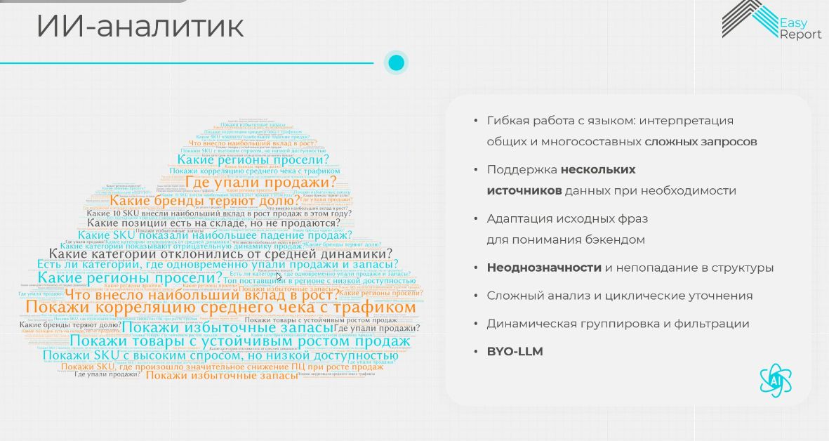 Значительный шаг в развитии продукта Easy Report обусловлен приходом LLM. Представители компании заметили, что они долго к этому снаряду подходили, долго запрягали, но быстро поехали. Теперь Easy Report умеет обрабатывать очень сложные запросы, в том числе составные, когда требуется осуществить корреляцию на средний чек или объем трафика, если данные при этом находятся в разных моделях. Кроме того, благодаря трекингу Self-service пользователь может самостоятельно сделать себе заметку на предмет отслеживания конкретных показателей. И система уведомит о приближении пороговых значений.