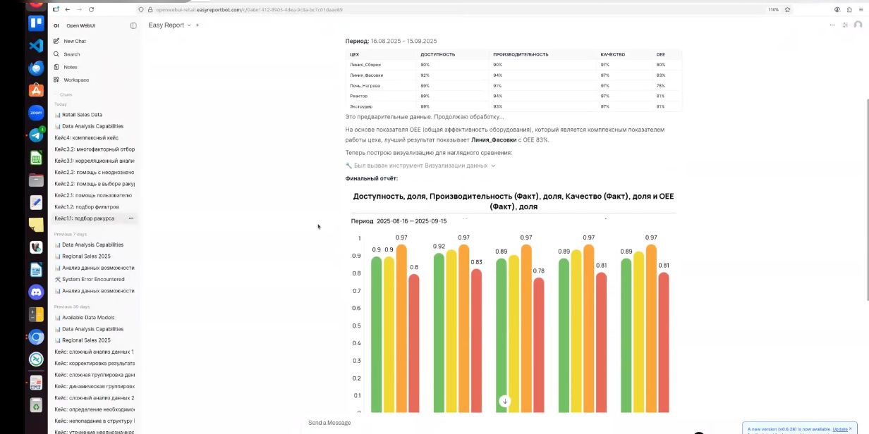 Возможности системы демонстрировались на примере двух кейсов в сфере продаж и производства продукции (себестоимости выпуска). Качество обработки естественного языка такое, что с системой можно общаться, корректировать направления действий. При этом LLM запоминает контекст, учитывает характер ошибки и корректирует себя, анализирует и делает выводы.