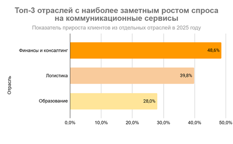 Наибольшую динамику спроса на подключение коммуникационных сервисов в 2025 в сравнении с предыдущим годом показали компании из сфер: финансы и консалтинг, логистика, образование. В области финансов и консалтинга заметно растет интерес к услуге маркировки звонков. Организации, которые специализируются на транспортных и логистических услугах, а также образовательные центры активно подключают сервисы речевой аналитики.
