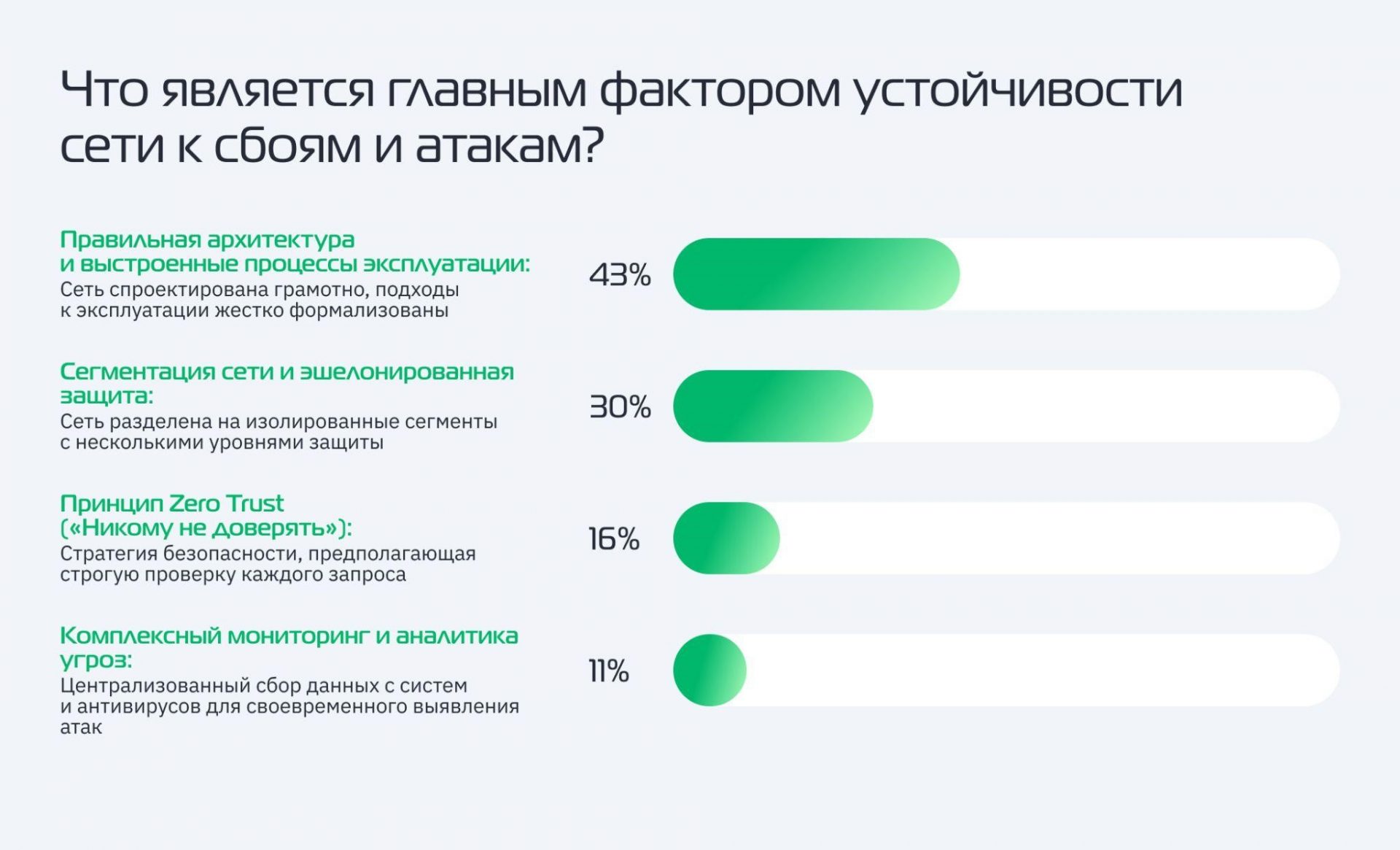 Фундаментом устойчивости сетей к сбоям и атакам большинство ИТ-руководителей (43%) считает правильную архитектуру и выстроенные процессы эксплуатации. Почти треть респондентов (30%) внедряют эшелонированную защиту и изолируют сегменты сети, а 16% обеспечивают безопасность через внедрение принципа Zero Trust («Никому не доверять»), требуя строгой проверки каждого запроса. Еще 11% делают упор на комплексный мониторинг и аналитику угроз с помощью SIEM и DLP-систем.
