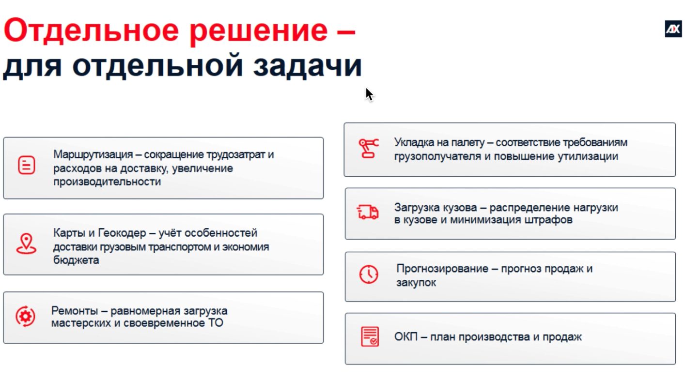 Логистические компании десятилетиями полагались на ручное планирование. Увеличение объемов перевозок, требования маркетплейсов к укладке грузов и штрафы за нарушение правил проезда заставили бизнес искать другие методы. В рамках вебинара эксперты компании AXELOT представили линейку из семи сервисов, построенных на алгоритмических самообучающихся моделях и рассказали как с их помощью можно оптимизировать логистические процессы бизнеса.