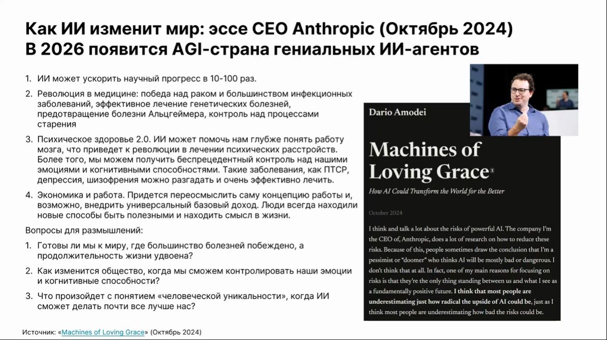 В разговоре на эту тему не мог не возникнуть вопрос о месте и роли человека. По словам эксперта, машины не умеют порождать ничего нового. У них огромная насмотренность, они конструируют предлагаемые решения путем смешения. Удел человека – создавать принципиально новые сущности, на что не способна машина. В будущем востребованными окажутся те, кто найдет правильное применение полноценному естественному мозгу человека. Правда, открытым остается вопрос о том, что произойдет с понятием человеческой уникальности, когда ИИ сможет почти все делать лучше нас.