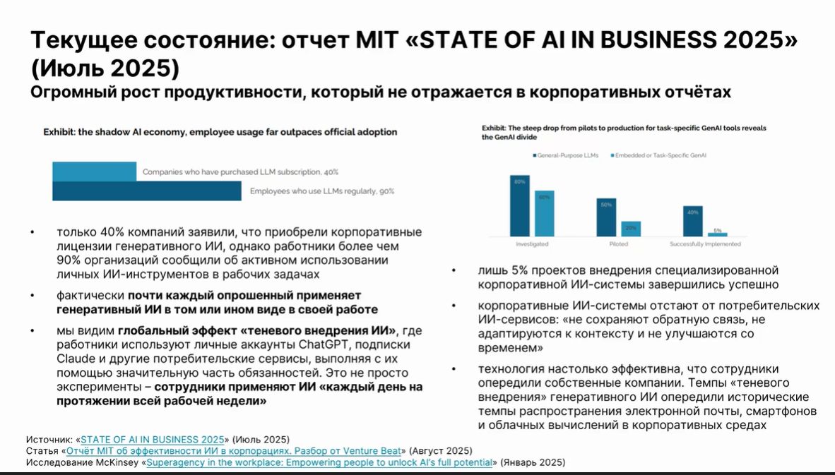 Согласно отчету MIT, по состоянию на июль 2025 г. 90% опрошенных сотрудников крупных компаний используют ИИ на повседневной основе для решения в том числе служебных задач. При этом только 40% работодателей респондентов внедрили у себя в контуре большие языковые модели для внутреннего пользования.