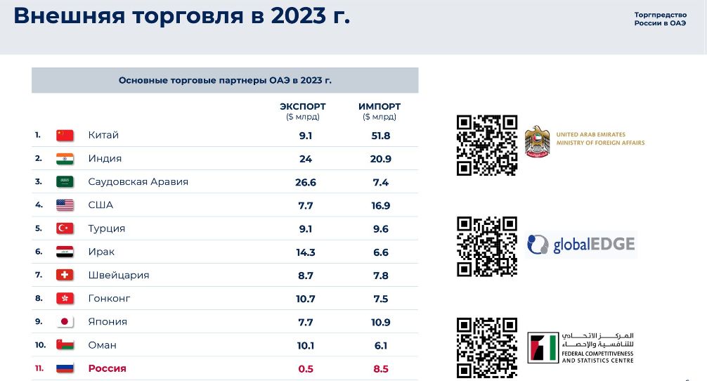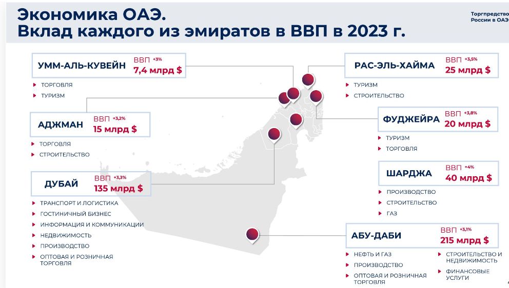 Интерес к рынку Объединенных Арабских Эмиратов не случаен. Это вторая по величине экономика арабского мира, самый высокотехнологичный рынок Ближнего Востока. Для российских экспортеров предусмотрен льготный налоговый режим. Действует Единый таможенный союз – Совет сотрудничества арабских государств Персидского залива. Хорошие перспективы реэкспорта через многочисленные свободные экономические зоны. Как показывает опыт, более половины ввезенных товаров и услуг направляются затем на другие зарубежные рынки. Благодаря комфортному инвестиционному законодательству сохраняются широкие возможности по открытию юридического лица в ОАЭ.