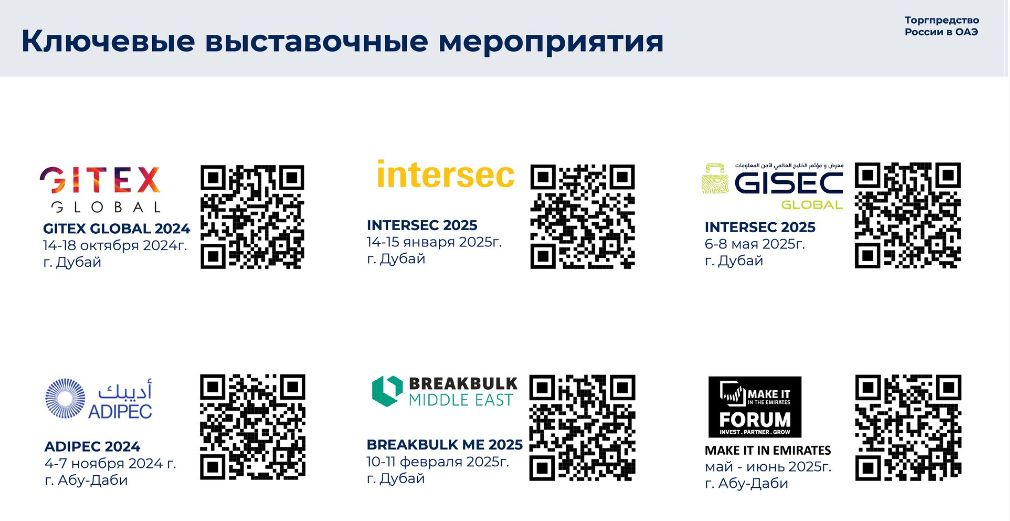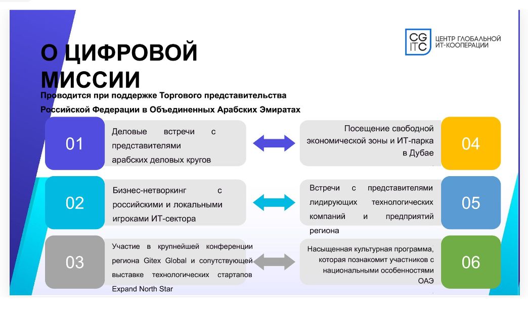 На середину октября запланировано проведение Цифровой миссии в ОАЭ. Мероприятие состоится при поддержке Минпромторга России, Торгового представительства РФ в Дубае, Федерального центра прикладного развития искусственного интеллекта и Центра глобальной ИТ-кооперации. В программе – деловые встречи, бизнес-нетворкинги с локальными игроками ИТ-сектора, участие в крупнейшей региональной конференции Gitex Global, выставке технологических стартапов Expand North Star и т. д.