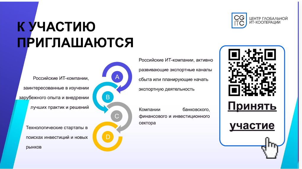 Центр компетенций по глобальной ИТ-кооперации был создан в 2000 г. для укрепления экспортного сотрудничества России и международного сообщества в сфере ИТ. С 2023 г. приоритетное направление работы организации – содействие экспорту российских цифровых решений с высоким экспортным потенциалом в дружественных странах.