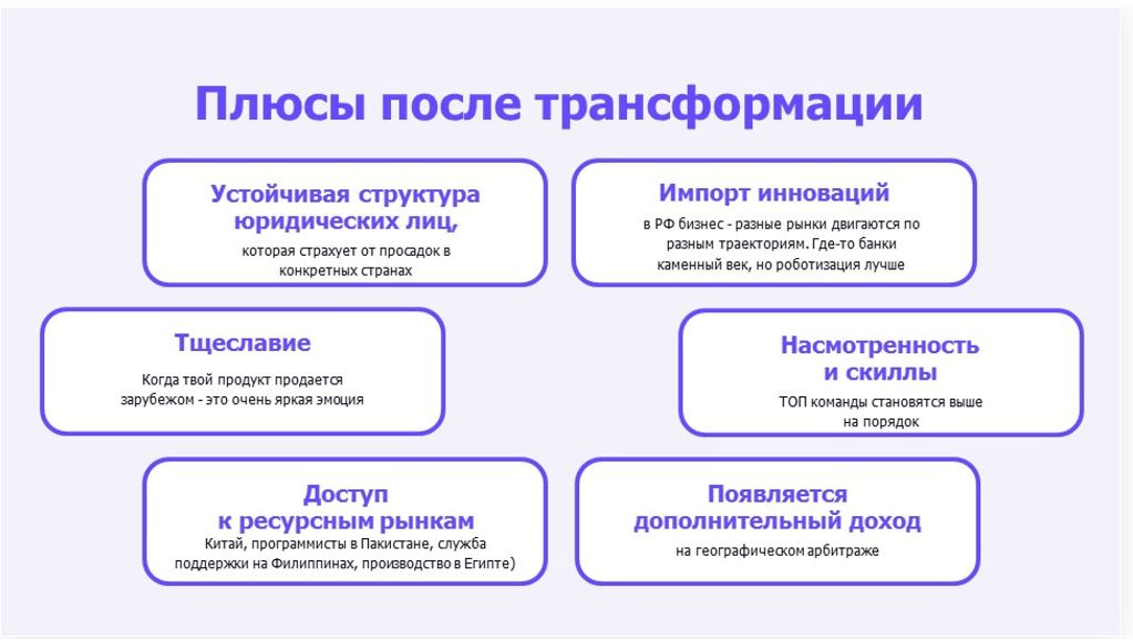 Согласно концепции Global Shift, любой бизнес состоит из ряда элементов, которые при зарубежной экспансии не следует копипастить или воспроизводить их все в новой стране, например, клонировать схему российского бизнеса. Важно рассредоточить эти элементы по разным странам так, чтобы добиться выгоды, а для этого составить план – как, что и где разместить. Например, производство находится в недорогой зоне (Китай, Турция), а рынок сбыта – в дорогих странах (таких как ОАЭ), для техподдержка подойдет Египет, при этом пакистанские программисты обойдутся дешевле избалованных сбербанками и яндексами российских.