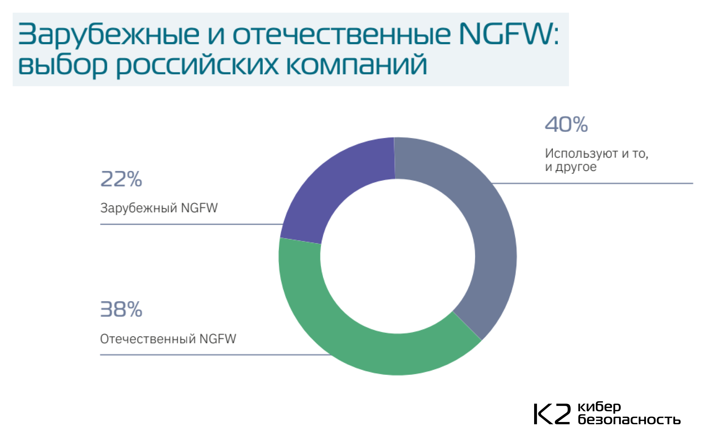- Несмотря на уход большинства зарубежных поставщиков, 62% корпораций продолжают использовать иностранные NGFW — исключительно (22%) или в сочетании с отечественными продуктами (40%). Лишь 38% участников исследования сообщили о полном переходе на отечественные NGFW.