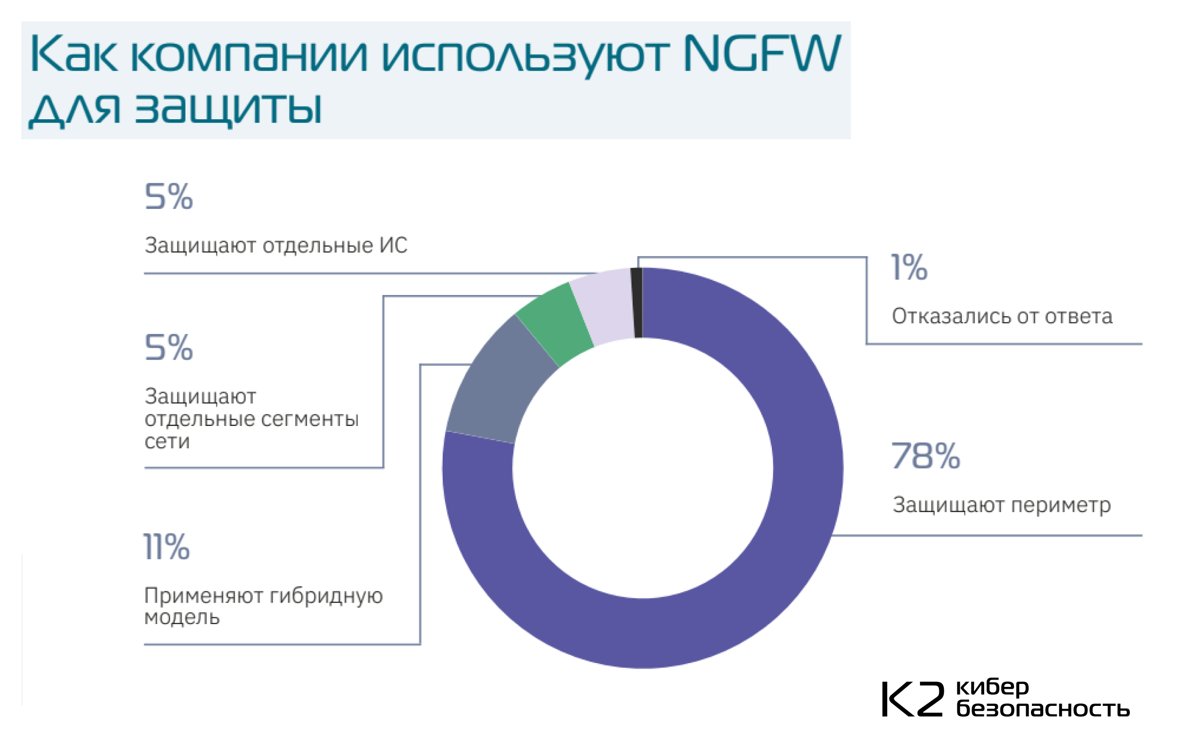 - Большинство организаций (78%) используют NGFW для защиты периметра, однако часть из них применяет гибридную модель, совмещая контроль периметра с защитой критичных сегментов и отдельных информационных систем (11%). Главными отдельными функциями NGFW респонденты выделили: удаленный доступ к VPN, интеграцию site-to-site VPN, поддержку ГОСТ-алгоритмов в VPN, виртуальные контексты.