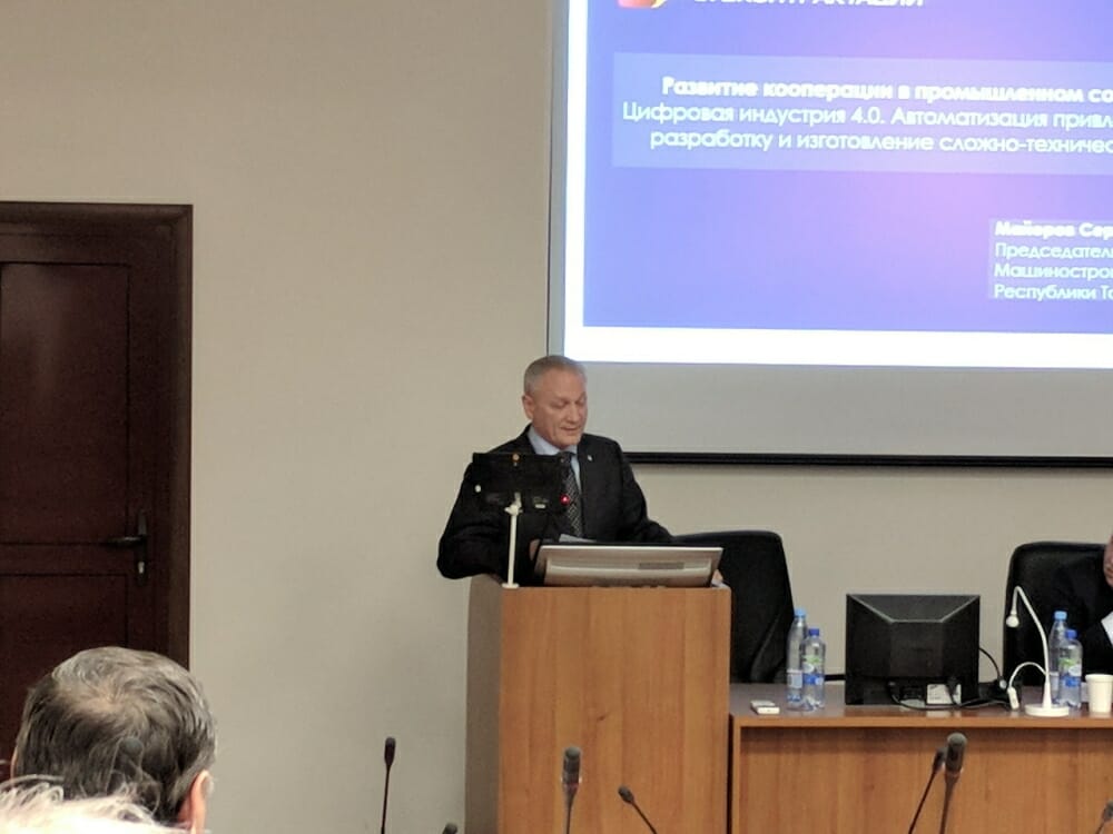 Сергей Майоров, председатель Правления Машиностроительного кластера Республики Татарстан, выступил с докладом на тему «Развитие кооперации в промышленном сотрудничестве. Цифровая индустрия 4.0. Автоматизация привлечения заказов на разработку и изготовление технической продукции».