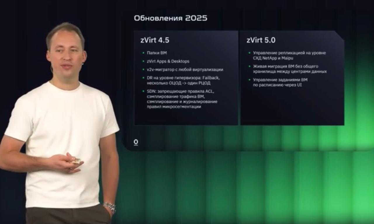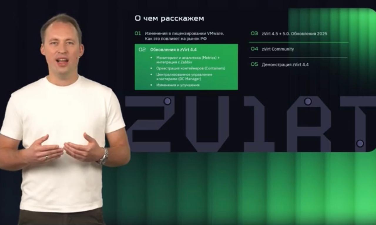 На прошедшем вебинаре компании Orion Soft были представлены ключевые обновления zVirt 4.4, в том числе интеграция кластеров Kubernetes и новые возможности мониторинга и управления большими инсталляциями виртуализации. Участники узнали о значительных изменениях в лицензировании VMware и их влиянии на рынок России, а также о предстоящих обновлениях zVirt 4.5 и 5.0, запланированных на текущий год.