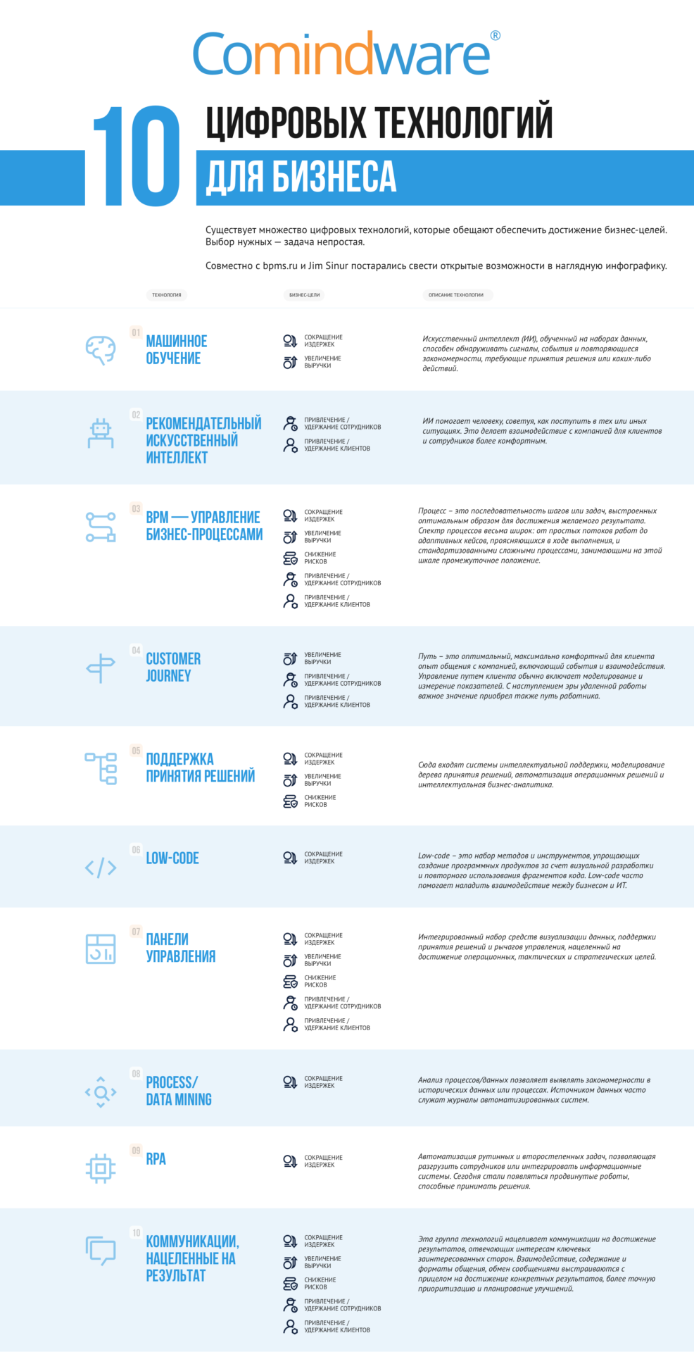 Компания Comindware проанализировала отчеты ведущих исследователей ландшафта технологий и выделила из их выводов 10 ключевых цифровых инноваций, которые, по мнению экспертов, уже доказали свою эффективность. Для лучшего понимания, аналитики компании собрали данные из зарубежных исследований в формате инфографики.
