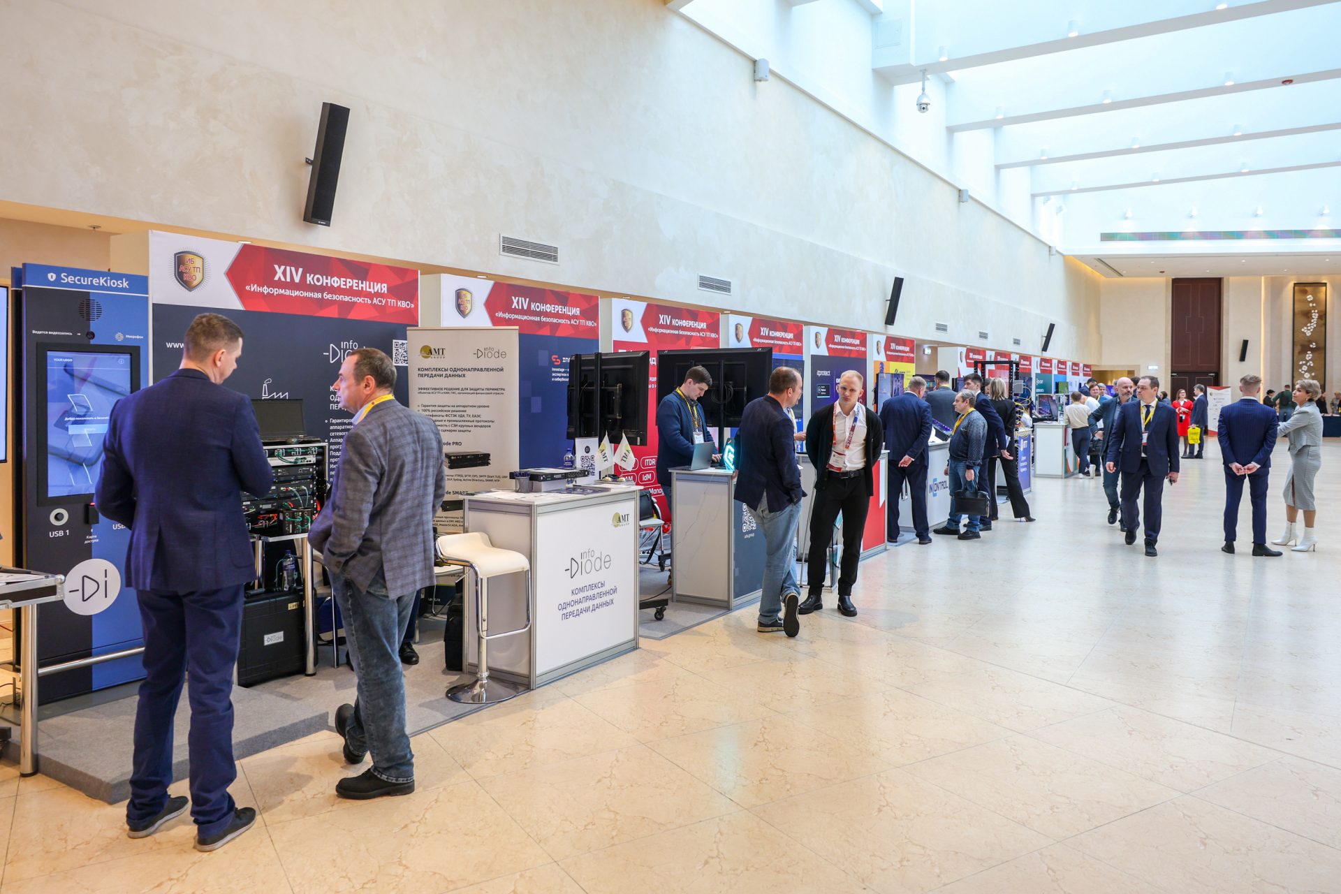 До начала пленарного заседания состоялся обход выставочной экспозиции, развернутой в фойе отеля Soluxe Hotel Moscow, где проходила конференция. Игроки рынка ИБ и ведущие разработчики АСУ ТП представили свои решения и провели краткие презентации.
