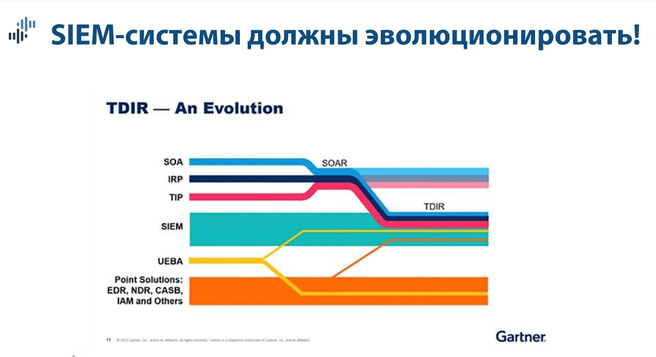 В дополнение информации о развитии и актуализации SIEM-системы спикер привел отчет Гартнера за 2022 г. В графике продемонстрировано, что в будущем SIEM-система превратится в продукт, который будет включать в себя и IRP, и SOAR. SIEM-система станет по сути центральным продуктом, который будет важен для каждого заказчика. В перспективе в функционал SIEM-системы будет включена киберразведка.