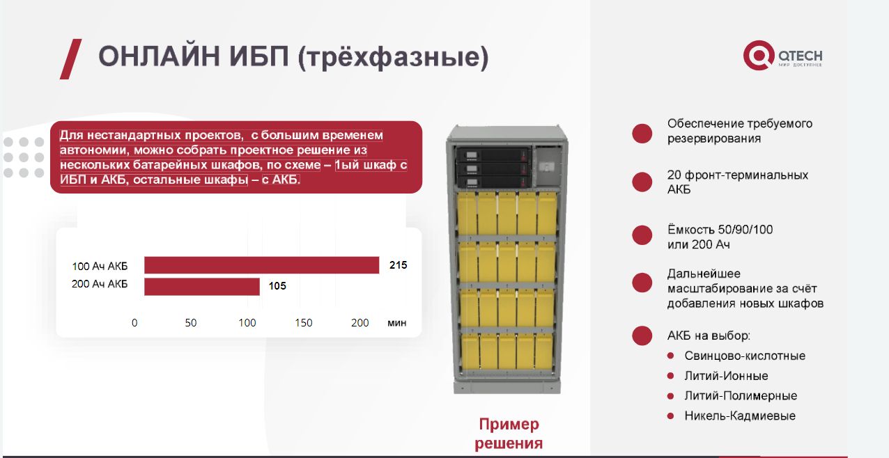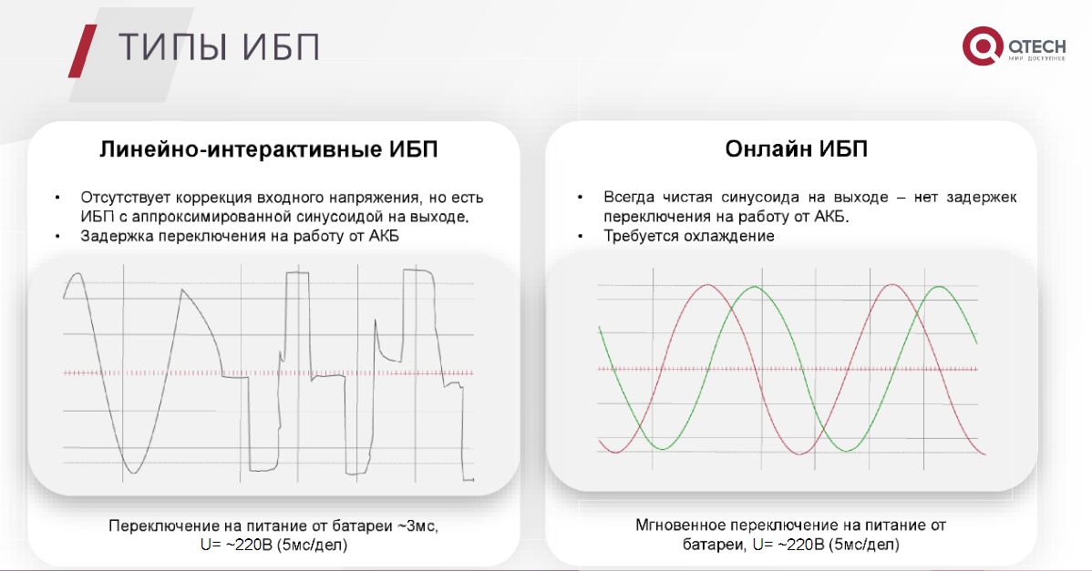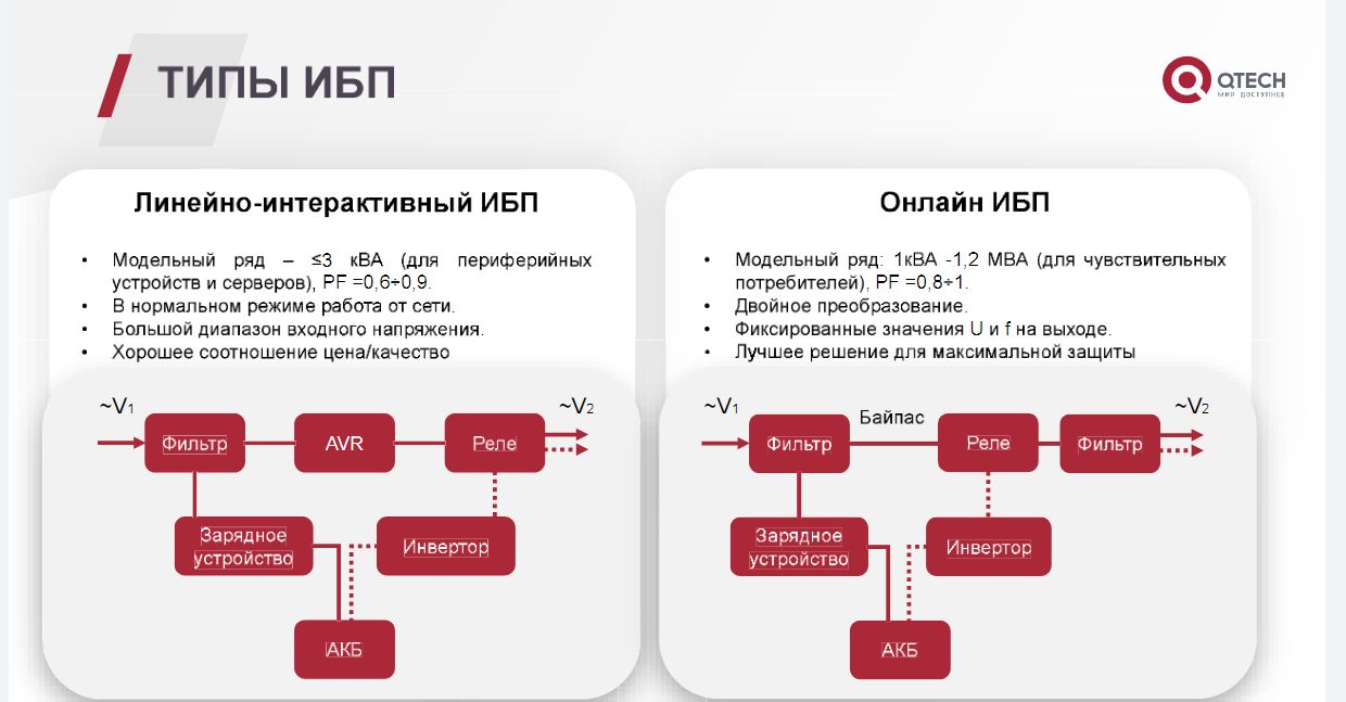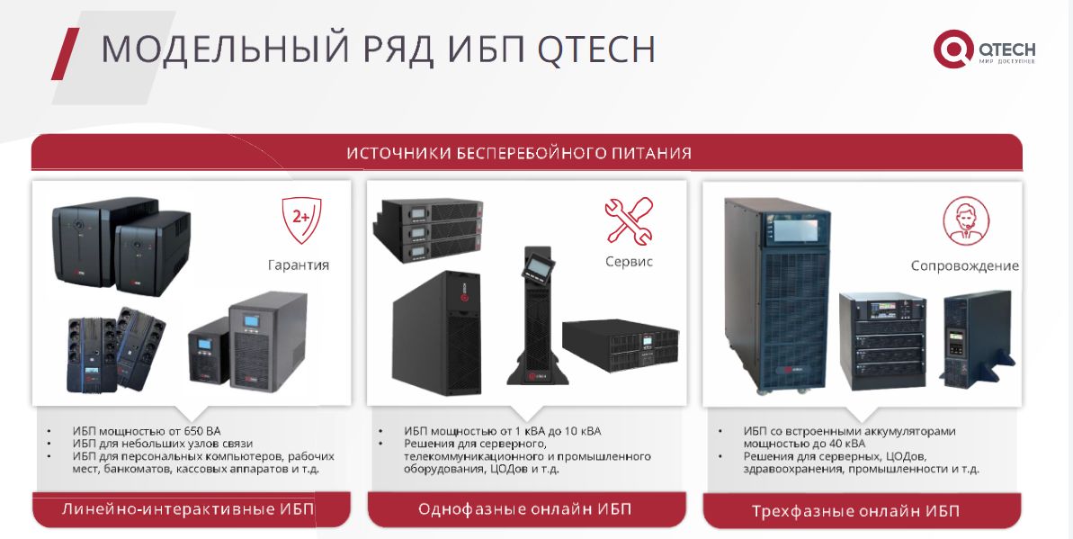 Компания QTECH предлагает широкий модельный ряд устройств, в него входят линейно-интерактивные ИБП, однофазные и трехфазные онлайн-ИБП.