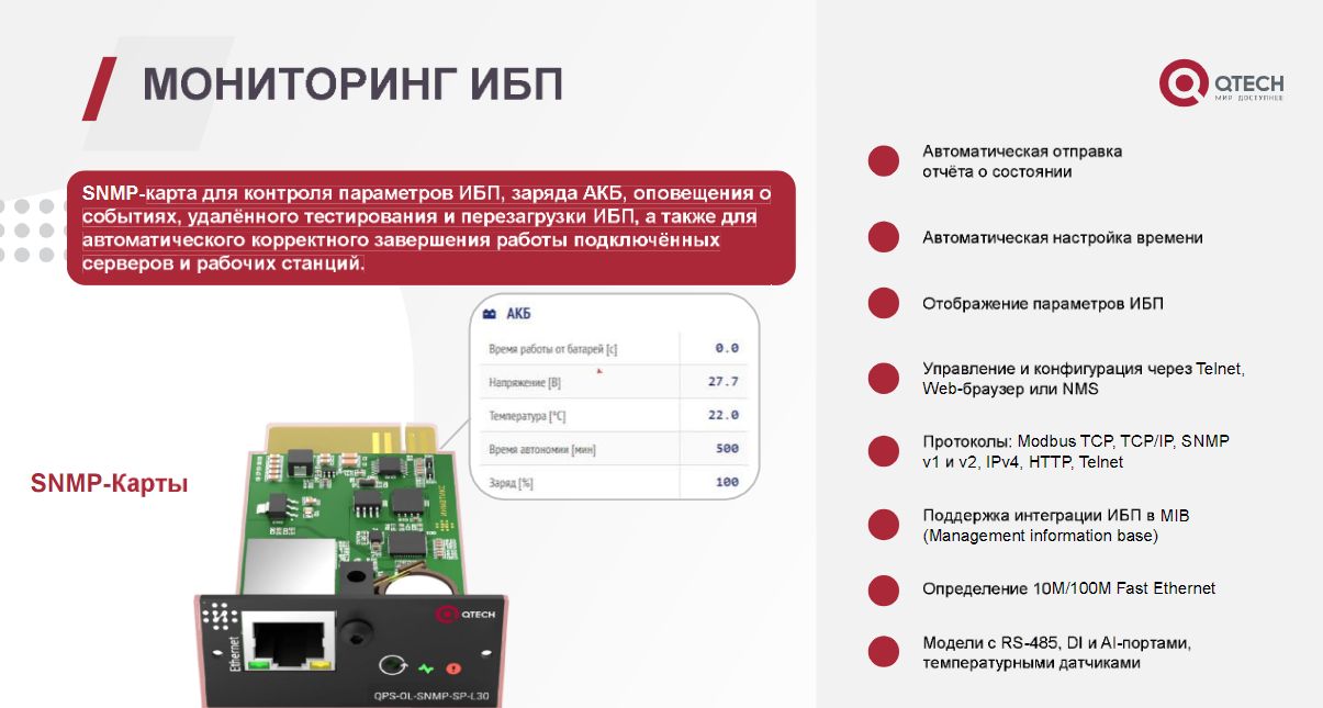 В продуктовом арсенале QTECH представлена SNMP-карта для контроля параметров ИБП, заряда АКБ, оповещения о событиях, удаленного тестирования и перезагрузки источников бесперебойного питания, а также для автоматического корректного завершения работы подключенных серверов и рабочих станций.