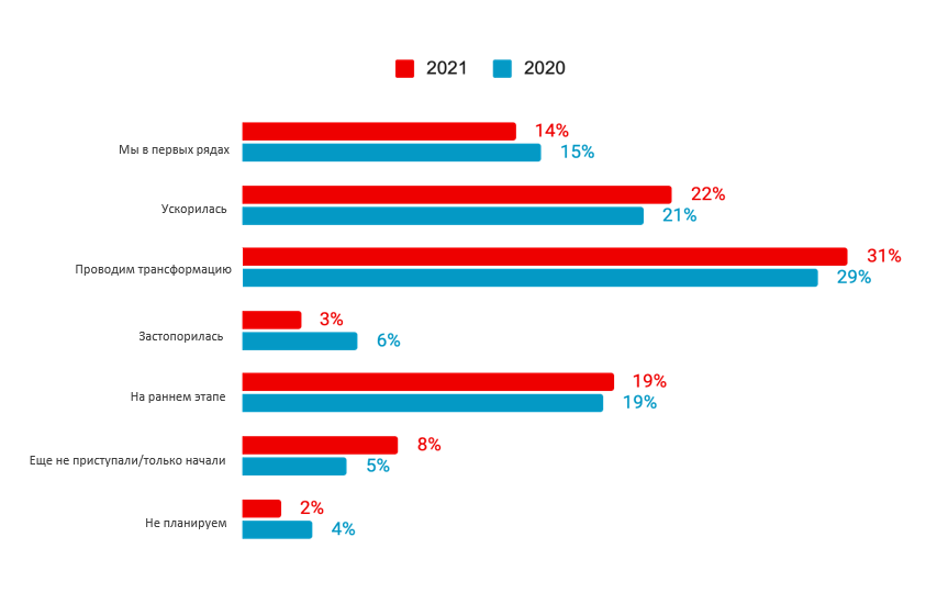 В прошлом году мы отмечали, что представители самых разных отраслей ускоряют планы цифровой трансформации для борьбы с последствиями продолжающейся пандемии. В этом году, судя по ответам респондентов, тенденция сохранилась. Всё больше компаний используют технологии и процессы как драйвер инноваций и трансформации бизнеса (31% против 29% в прошлом году), либо ускорили свои усилия по цифровой трансформации (22% против 21%), называя среди причин в качестве такого ускорения глобальную пандемию (52%) и рост выручки (50%). Все меньше респондентов считают, что их инициативы по цифровой трансформации стагнируют (3%), и все больше участников нашего опроса находятся на ранних стадиях запуска проектов трансформации (8%), что только подчеркивает эту тенденцию.