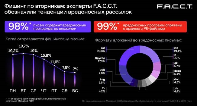 Компания F.A.С.С.T., российский разработчик технологий для борьбы с киберпреступлениями, назвала основные тренды вредоносных почтовых рассылок в 2023 году. Вторник стал самым популярным у злоумышленников днем недели для отправки фишинговых писем. Почти 98% обнаруженных в рассылках вредоносных программ были спрятаны во вложениях, а самой распространенной «упаковкой» для них остаются .rar и .zip архивы. Эксперты отмечают высокое качество писем-приманок, которое раньше могли себе позволить лишь профессиональные преступные APT-группы (Advanced Persistent Threat).