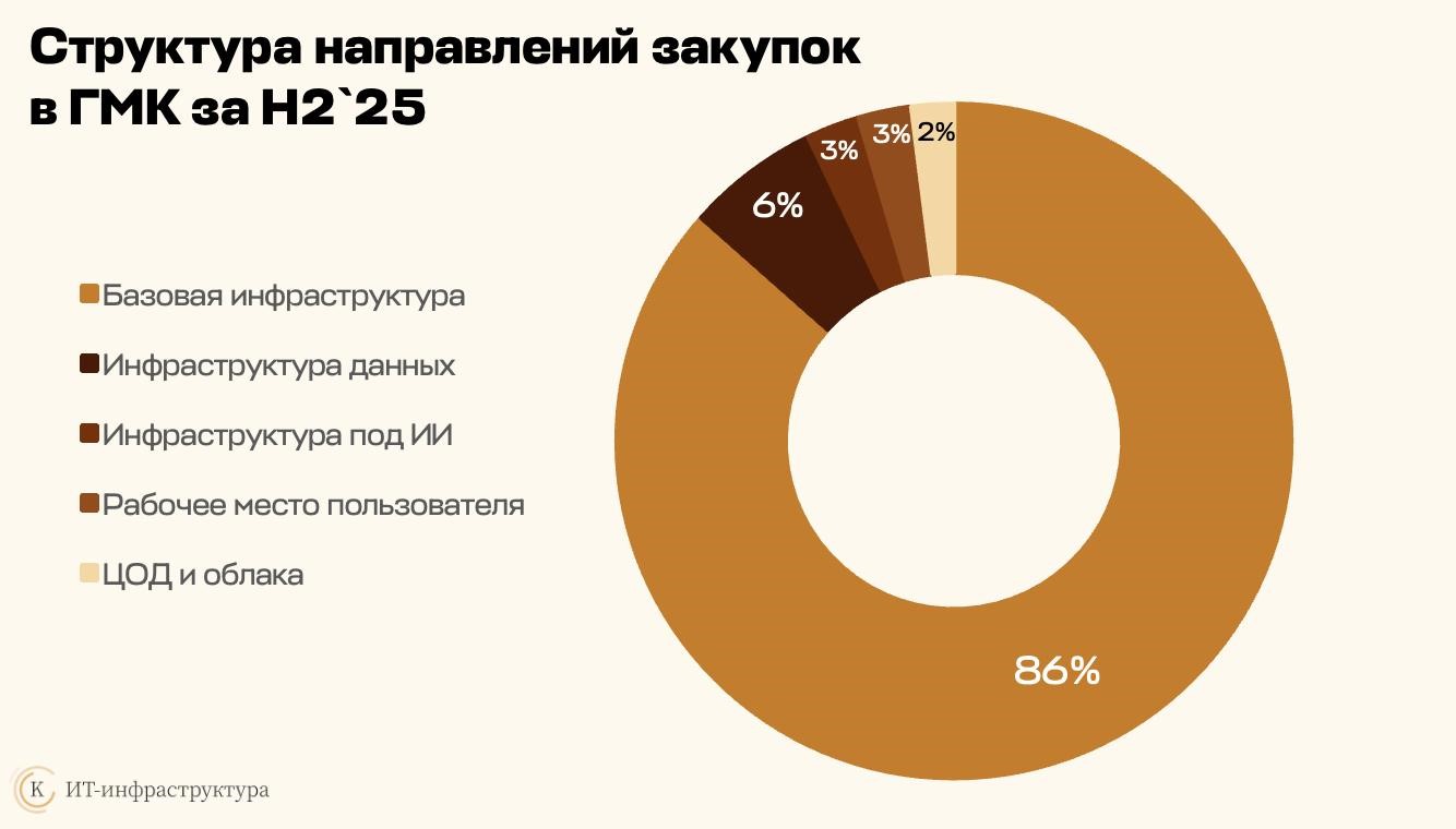 Снижение общей активности сопровождается смещением приоритетов. Закупки во втором полугодии 2025 года почти полностью ориентированы на поддержание существующей ИТ-инфраструктуры. Базовая инфраструктура занимает 86% всех закупок отрасли. Доля инфраструктуры данных составляет 6%, инфраструктуры для ИИ — 3%, решений для рабочих мест — 3%, коммерческих ЦОД и облаков — 2%.