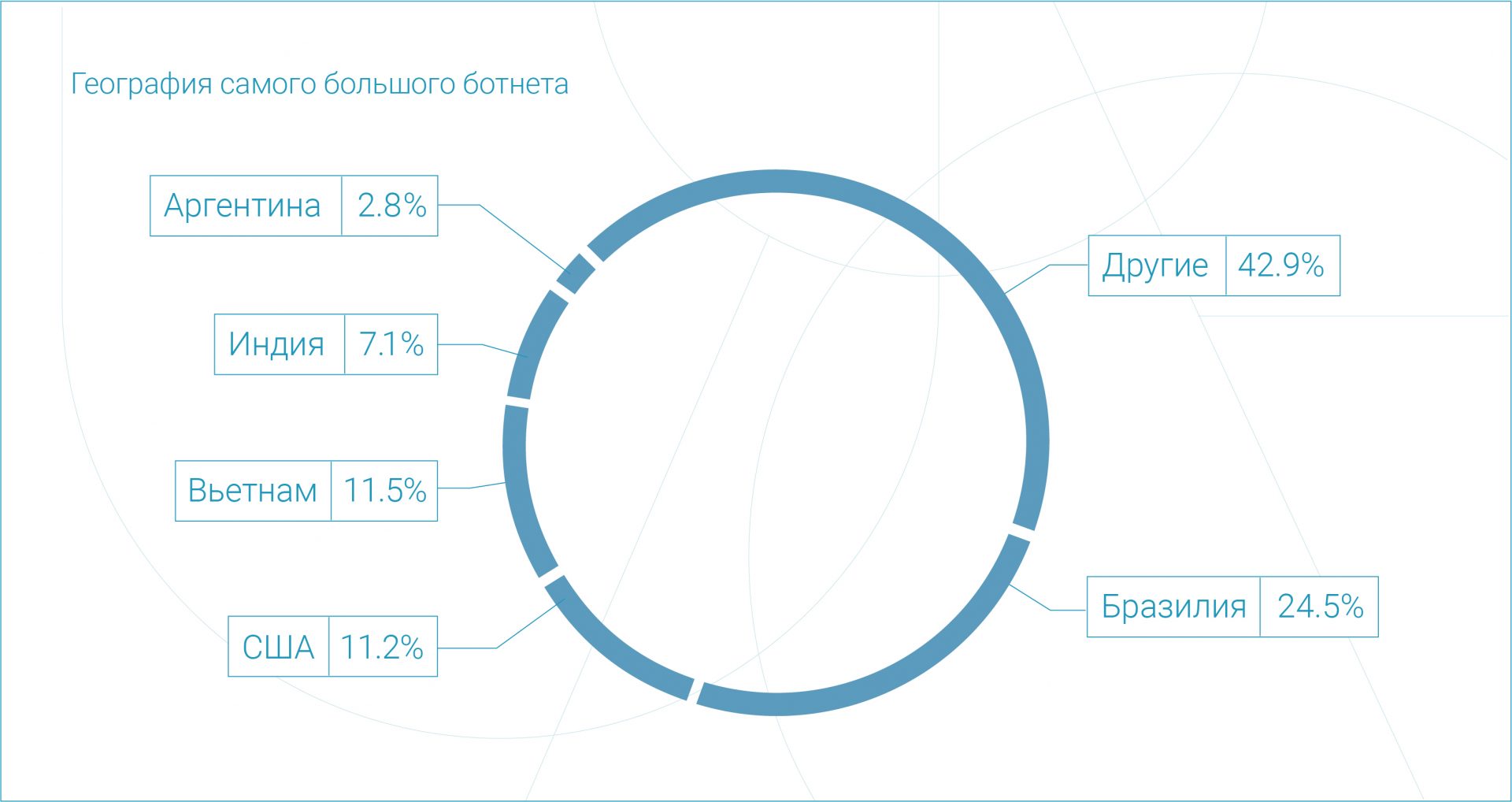 География ботнета отражает общую тенденцию этого года: центры DDoS-активности стремительно смещаются в развивающиеся регионы. Так, Бразилия впервые обогнала Россию и США, став крупнейшим источником атак на уровне приложений (L7 DDoS) — 19% от общего объема вредоносного трафика. При этом наиболее впечатляющую динамику показал Вьетнам, поднявшийся за год с 15-го на 4-е место.