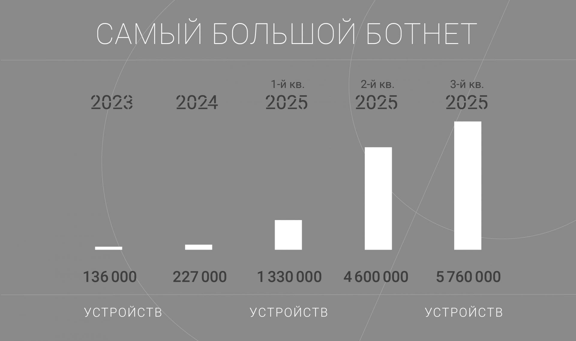 В третьем квартале 2025 года компания CURATOR зафиксировала новую атаку крупнейшего из известных ботнетов, который специалисты компании отслеживают уже более полугода. В этот раз в атаке участвовало 5,76 миллиона зараженных устройств, преимущественно из Бразилии, Вьетнама, США, Индии и Аргентины.
