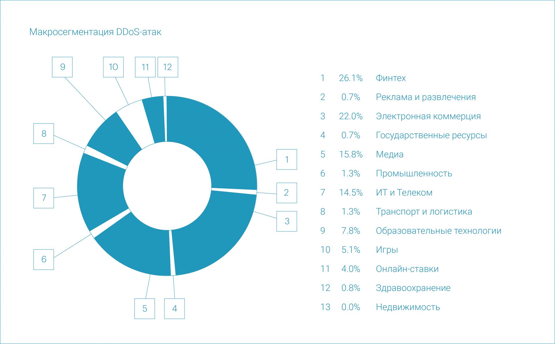 В третьем квартале DDoS-атаки чаще всего были нацелены на сегменты Финтех (26,1%), Электронная коммерция (22,0%), Медиа (15,8%), а также ИТ и телеком (14,5%).