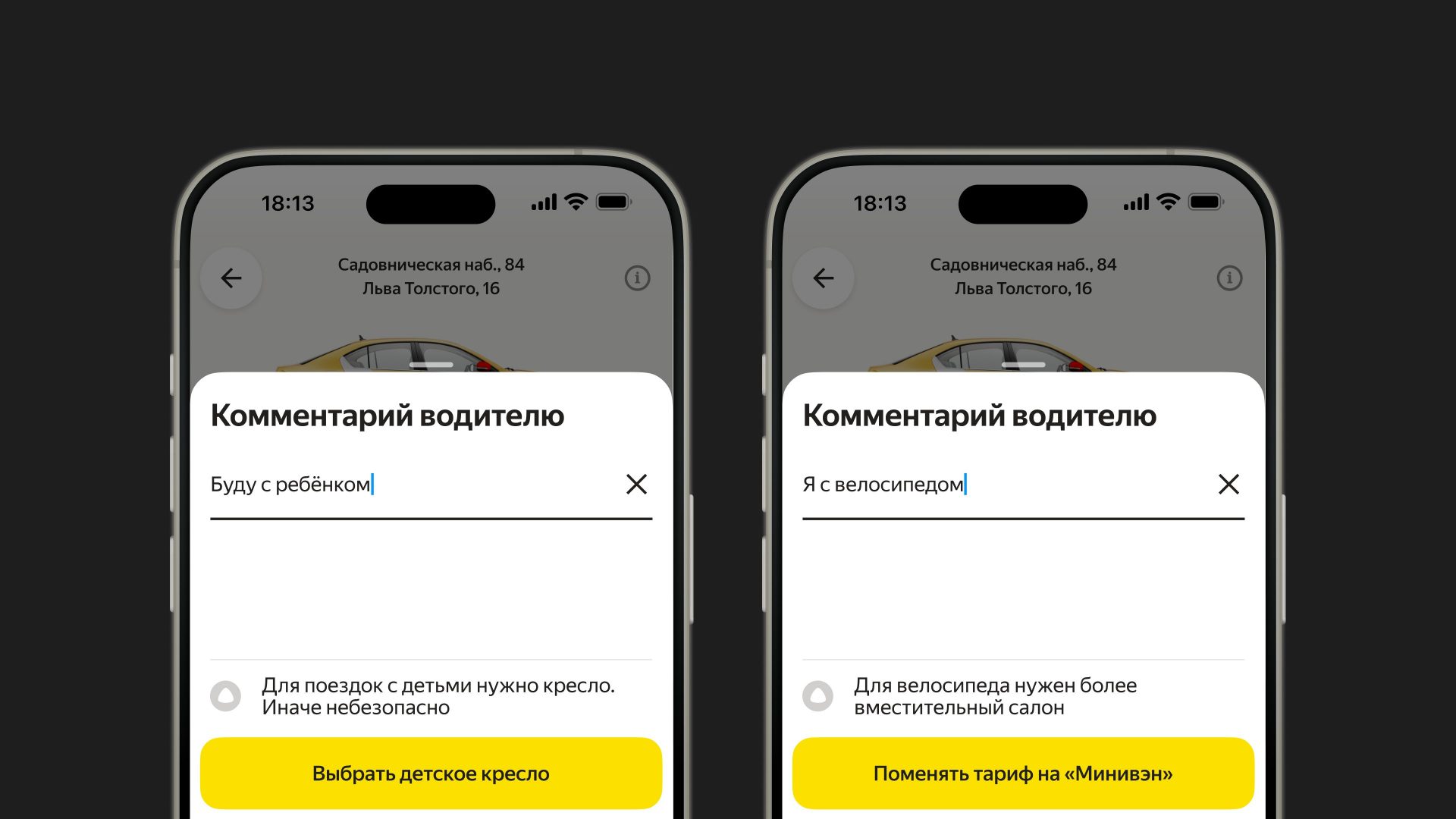 Искусственный интеллект в Яндекс Go на основе уточнения к заказу от пользователя поможет подобрать нужную опцию или тариф, в котором она доступна. Например, если написать «буду с 7-летним ребёнком», алгоритм семейства Alice AI порекомендует добавить детское кресло. А на комментарий «еду с велосипедом» — предложит сменить тариф с «Эконома» на «Минивэн», где доступна такая возможность. Это помогает избежать ситуаций, когда нужно уточнять параметры поездки с водителем при посадке или оформлять поездку заново.