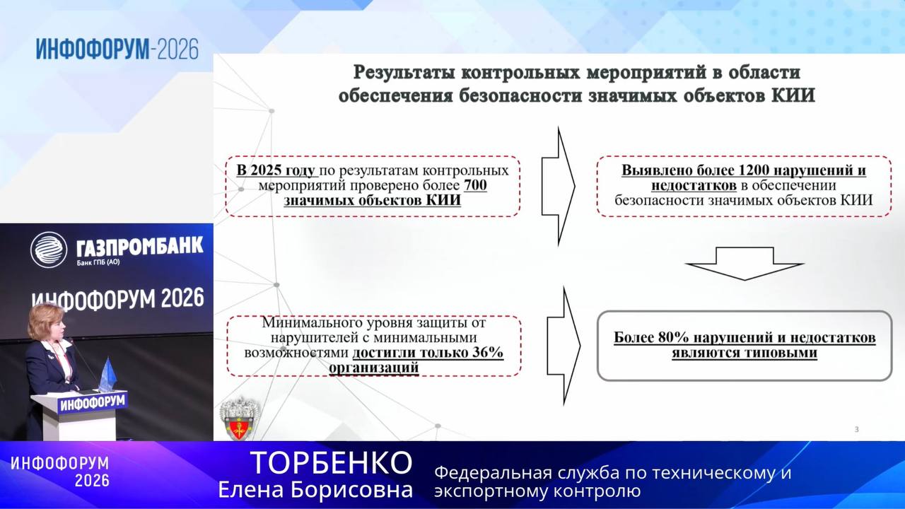 Начальник Управления ФСТЭК России Елена Торбенко в своем выступлении обозначила ключевые проблемы в области защиты КИИ и изменения в законодательстве. Эксперт отметила, что большинство нарушений, выявляемых в рамках государственного контроля, носят типовой характер. «Цифры – вещь неумолимая. И подавляющее большинство тех нарушений, с которыми мы встречаемся, это типовые нарушения», – подчеркнула Елена Торбенко.