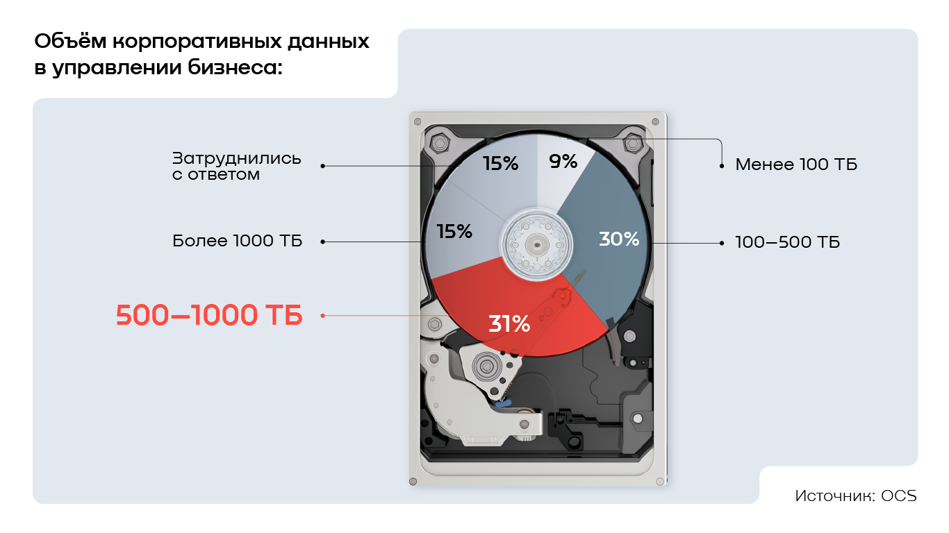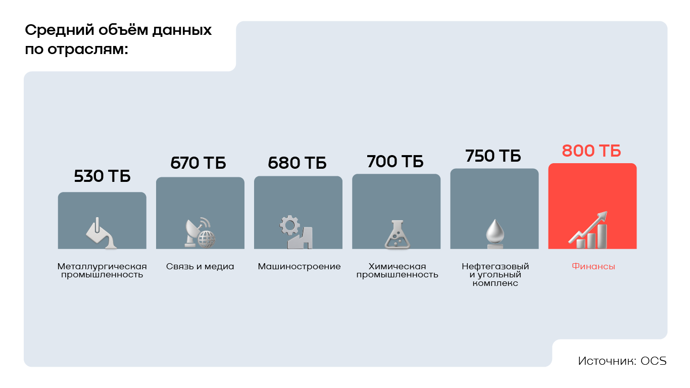 Чаще всего бизнес оперирует 500–1000 ТБ данных при ведении своей операционной деятельности — этот объём назвал 31% компаний, опрошенных в рамках исследования OCS. Более скромные 100–500 ТБ находятся в управлении ещё 30% респондентов. При этом каждая седьмая организация (15%) работает с очень большими объёмами информации — свыше 1000 ТБ. В разрезе отраслей лидерами по количеству корпоративных данных в управлении стали предприятия финансового сектора — в среднем представители фининдустрии работают с 800 ТБ. На втором месте оказались организации из нефтегазового и угольного комплекса с результатом в 750 ТБ, а на третьем — химическая промышленность со средним объёмом 700 ТБ.