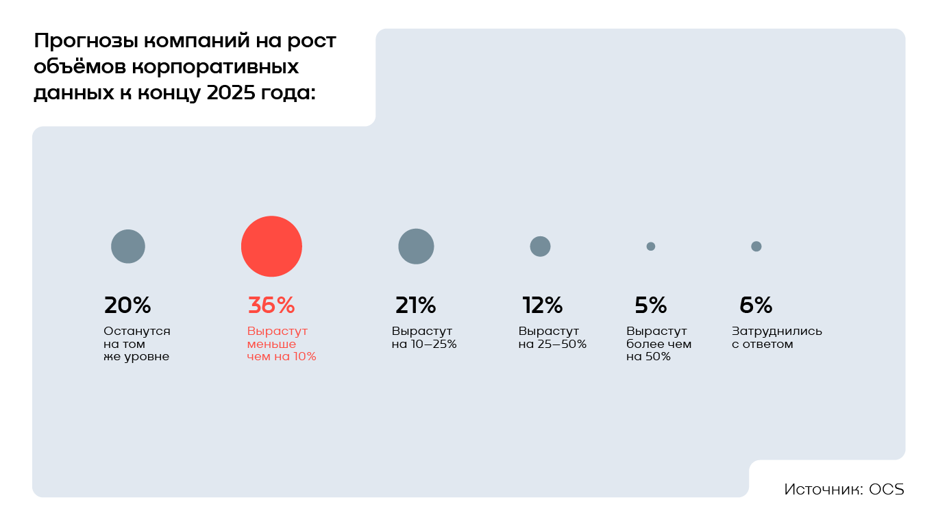 Большинство компаний (74%) прогнозируют рост объёмов корпоративных данных до конца 2025 года. Треть респондентов (36%) считает, что увеличение будет небольшим — в пределах 10%. 21% организаций готовится к повышению объёмов на 10–25%, а 17% — более чем на четверть.
