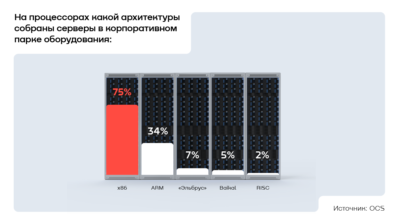 Российский бизнес стремится к созданию универсального парка вычислительных мощностей, который позволил бы отвечать на распространённые технологические вызовы. По этой причине компании выбирают проверенные подходы. 75% респондентов отметили, что пользуются наиболее популярной в мире серверной архитектурой x86 (Intel/AMD). В два раза реже организации обращаются к ARM (34%), а «Эльбрус» и Baikal во время опроса назвали 7% и 5% компаний соответственно. Самой редкой архитектурой стала RISC — её упомянули только 2% опрошенных.