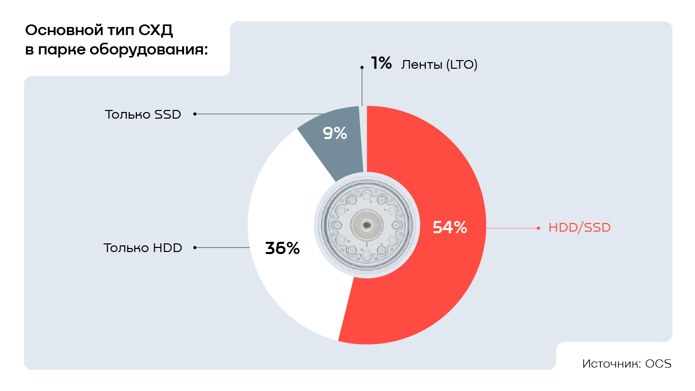 Исследование OCS также зафиксировало высокий интерес предприятий к «гибридным» типам инфраструктуры: свыше половины компаний (54%) используют одновременно HDD- (Hard Disk Drive) и SSD-накопители (Solid-State Drive) в парках СХД. Треть респондентов (36%), в свою очередь, выбирает «классику» — HDD-системы. Парк только на SSD-решениях остаётся нишевым вариантом — чистые All Flash Array оказались у 9% опрошенных.
