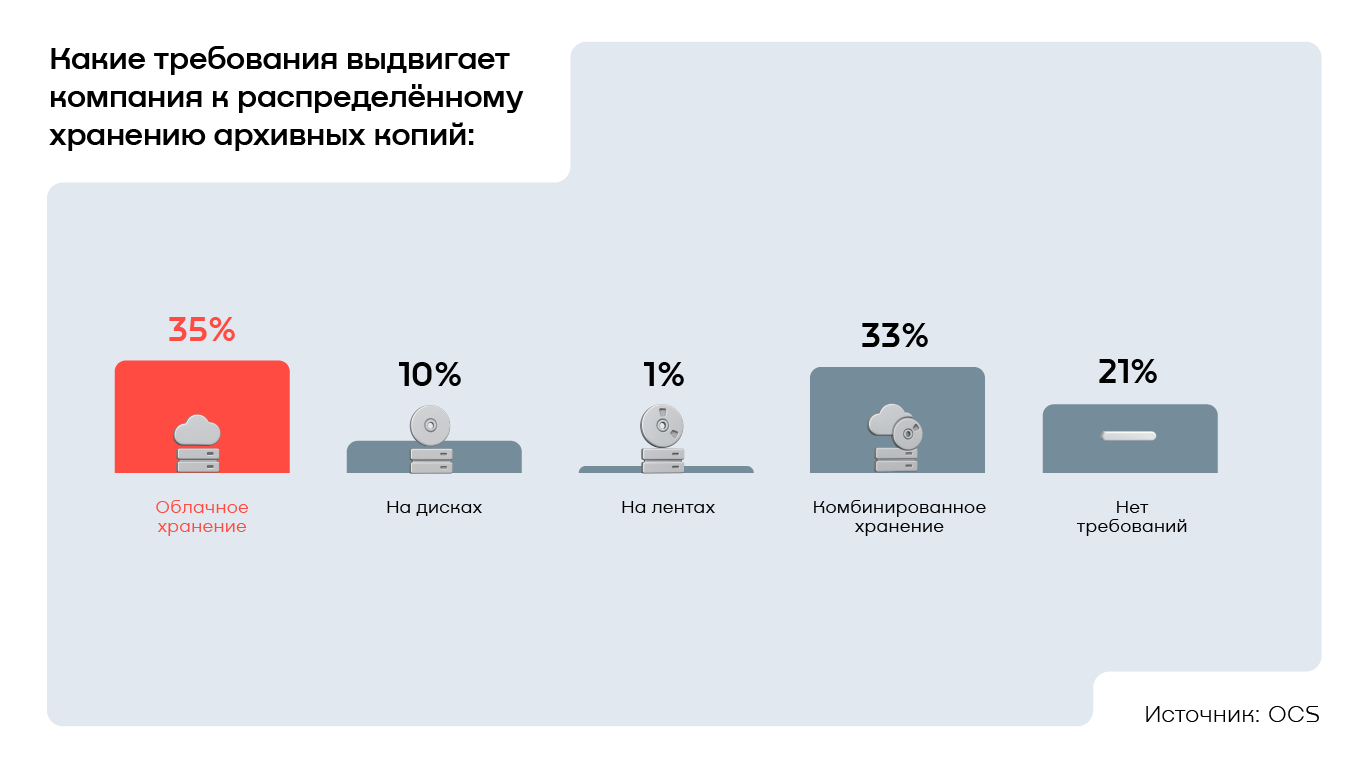 Под влиянием быстрого роста объёмов корпоративной информации формируется ещё один тренд — бизнес внедряет такие механики работы с данными, которые позволяют вести операционную деятельность, не перегружая вычислительные и финансовые ресурсы предприятия. Исследование OCS показало, что у 79% российских компаний есть регламенты относительно распределённого хранения архивных копий. Самый распространённый сценарий, согласно результатам опроса, — облачное хранение. Его отметили 35% опрошенных. На втором месте с небольшим отрывом находится комбинированное хранение, например сочетание лент и облачных сервисов, — такой ответ дали 33% компаний. Реже организации используют только диски и только ленты — на них пришлись 10% и 1% соответственно.