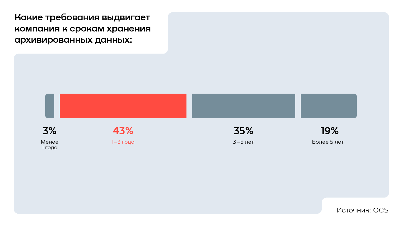 Самым популярным сроком хранения архивных данных стал временной диапазон от 1 до 3 лет — его отметили 43% компаний. 35% организаций выбирают промежуток от 3 до 5 лет. У 19% респондентов информация хранится дольше 5 лет. Самым непопулярным оказалось краткосрочное хранение — менее одного года данные хранят лишь 3% организаций.