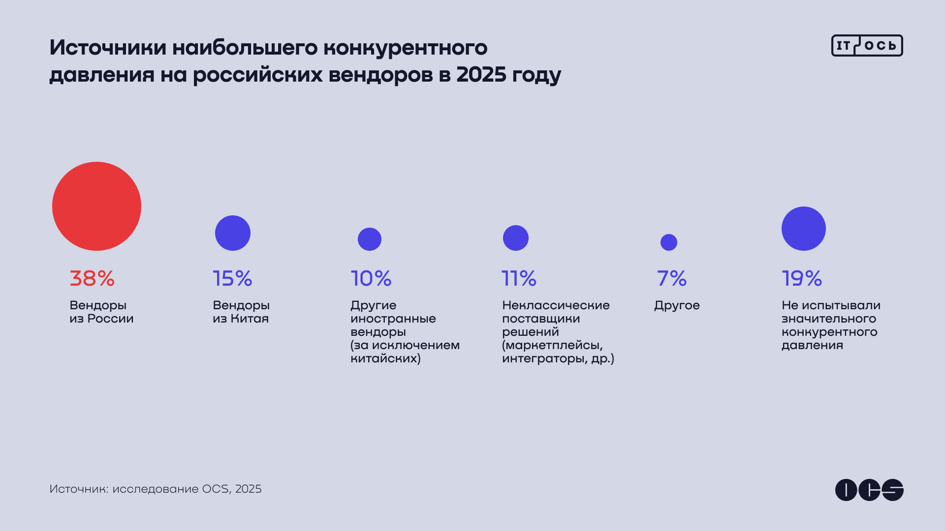 В 2025 г. многие российские вендоры видели главных конкурентов в своих соотечественниках: такой ответ во время опроса OCS дали 38% компаний. На втором месте с заметным отрывом (15%) оказались бренды из Китая. Ещё реже соперниками называли других иностранных производителей и неклассических поставщиков ИТ-решений вроде маркетплейсов или интеграторов – на них пришлось 10 и 11% соответственно.