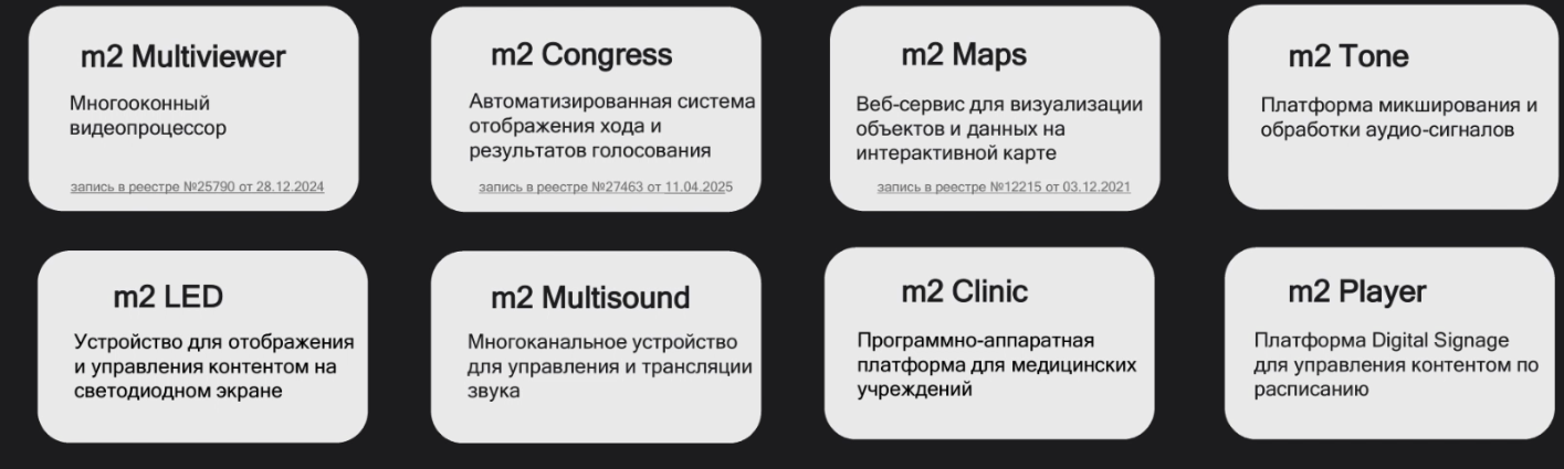 Продуктовый портфель «M2 Технологии» включает восемь линеек, объединенных принципом построения системы управления на основе веб-интерфейса. Аппаратная часть представляет собой серверное оборудование, конфигурация которого определяется задачами объекта.