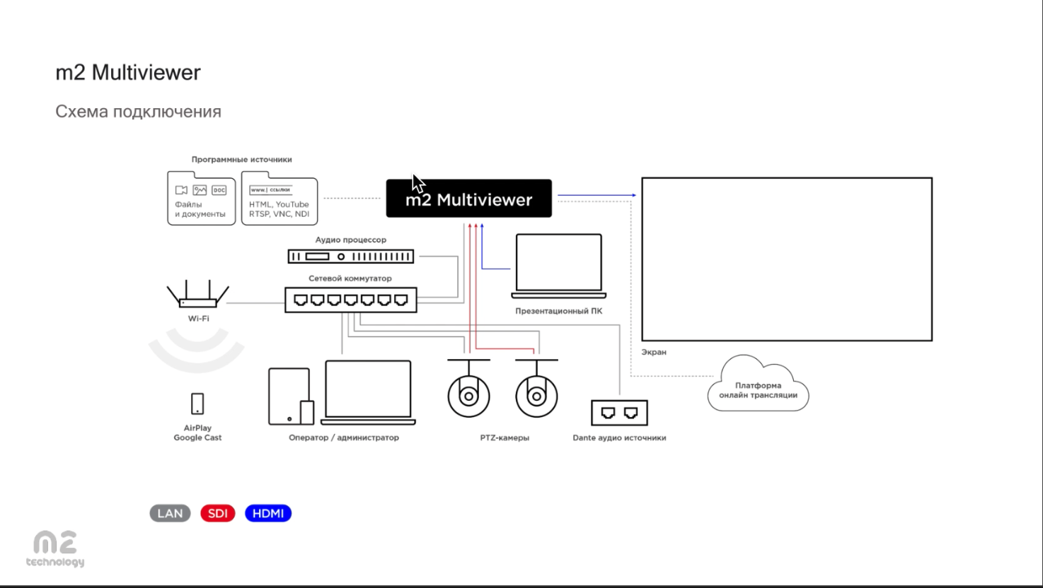 Основное устройство линейки – это M2 Multiviewer, который объединяет функции многооконного видеопроцессора, контроллера видеостены, матричного коммутатора, системы наложения графики, устройства записи и стриминга, контент-плеера, масштабатора, сервера управления сторонним оборудованием и платформы для беспроводного подключения устройств. Таким образом, настройка системы осуществляется на одном сервере, к которому подключается остальное оборудование, что позволяет исключить интеграцию разнородных устройств.