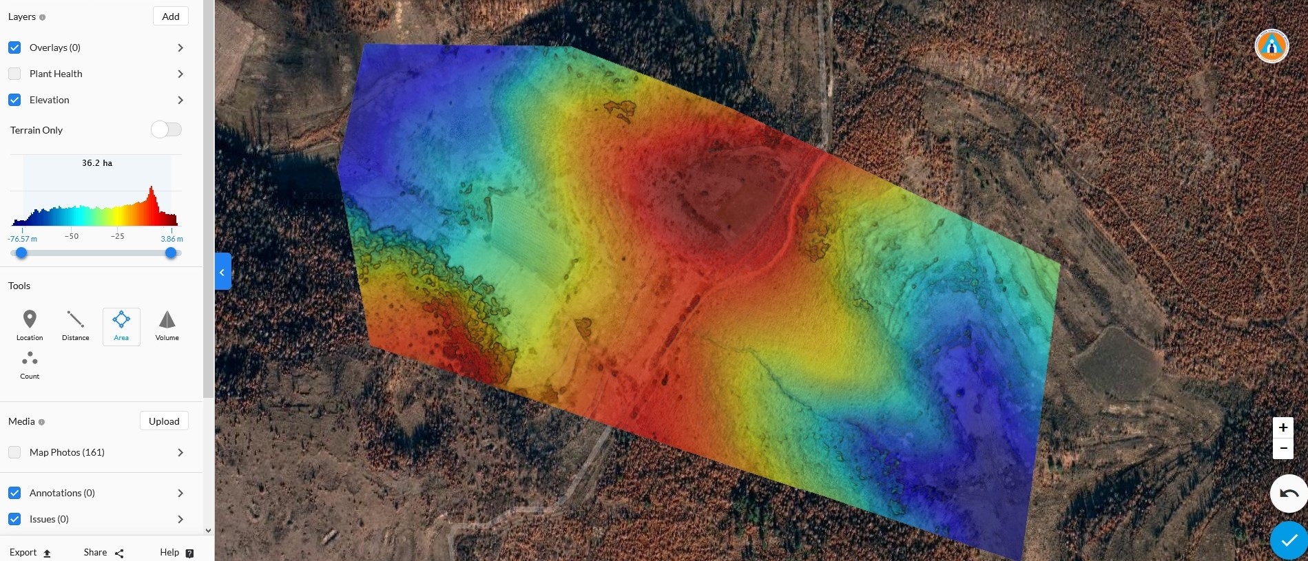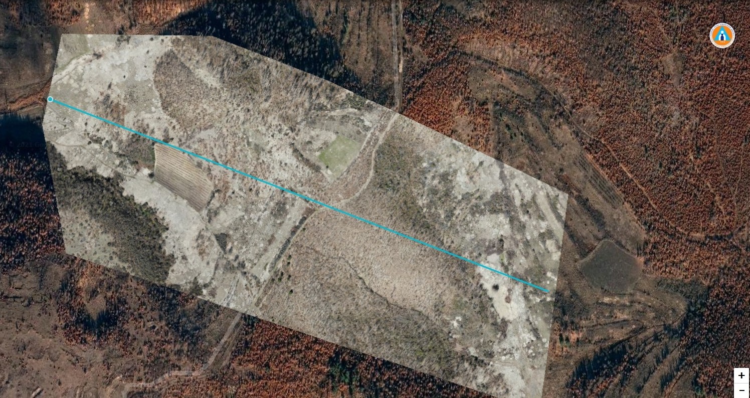 На этом снимке вы можете видеть последствия большого лесного пожара в труднодоступной местности. В рамках тестовой задачи мы создали карту данного участка на текущий момент с получением «свежей» картинки, данных по перепадам высот и площади участка.