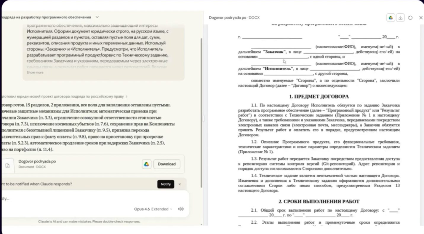 Эксперт подчеркивает, современные языковые модели демонстрируют впечатляющие результаты в договорной работе. Чтобы составить проект договора подряда на разработку ПО, достаточно загрузить в чат-бот примерные условия и описать желаемую структуру. Модель самостоятельно отформатирует документ, пронумерует разделы и пункты, создаст юридически стройный текст.