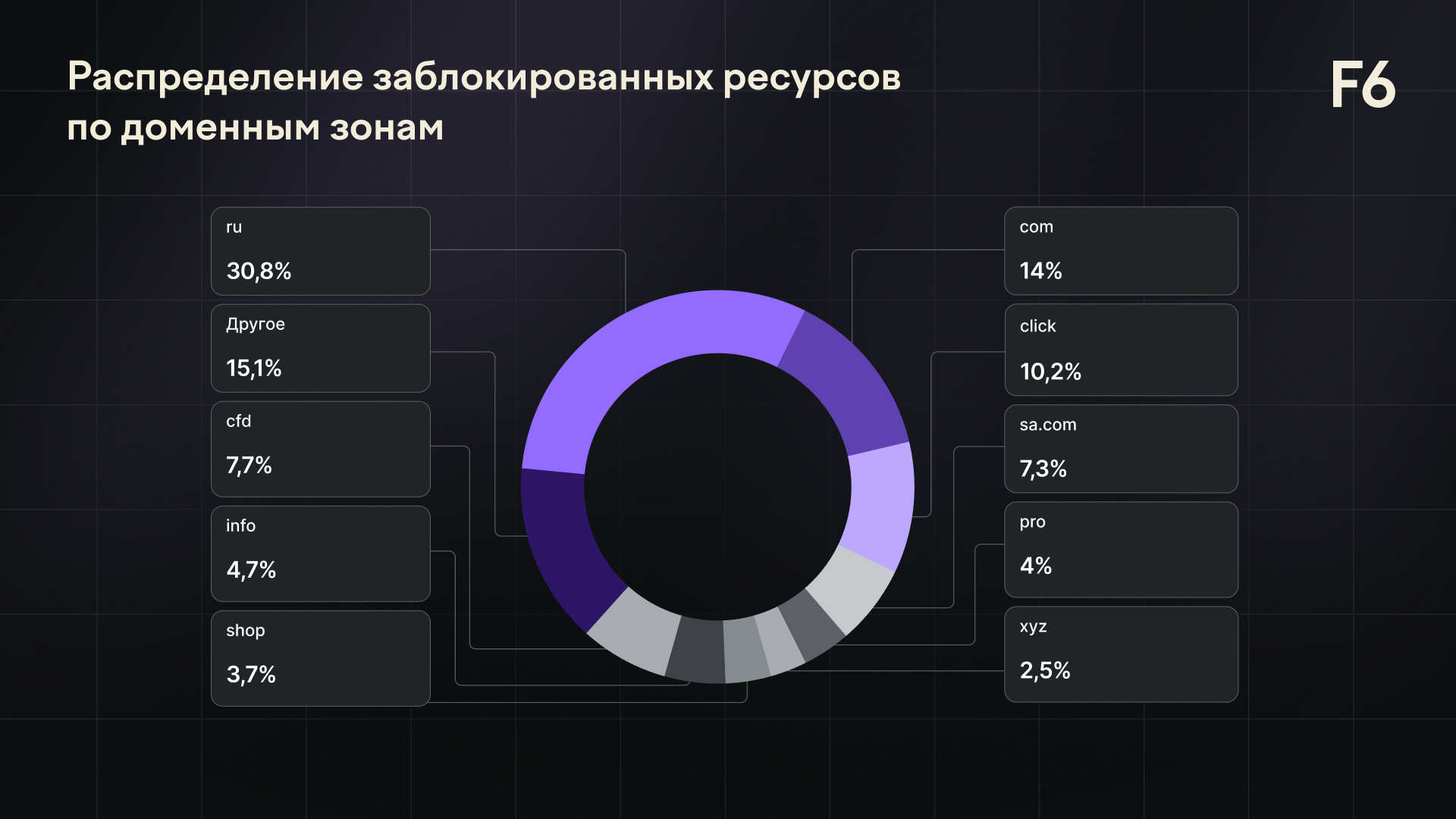 Больше всего в 2025 году ссылок с фишингом и скамом выявлено в доменной зоне .ru — 30,8%. Также в пятерку по популярности у злоумышленников вошли зоны .com (14%), .click (10,2%), .cfd (7,7%) и sa.com (7,3%).