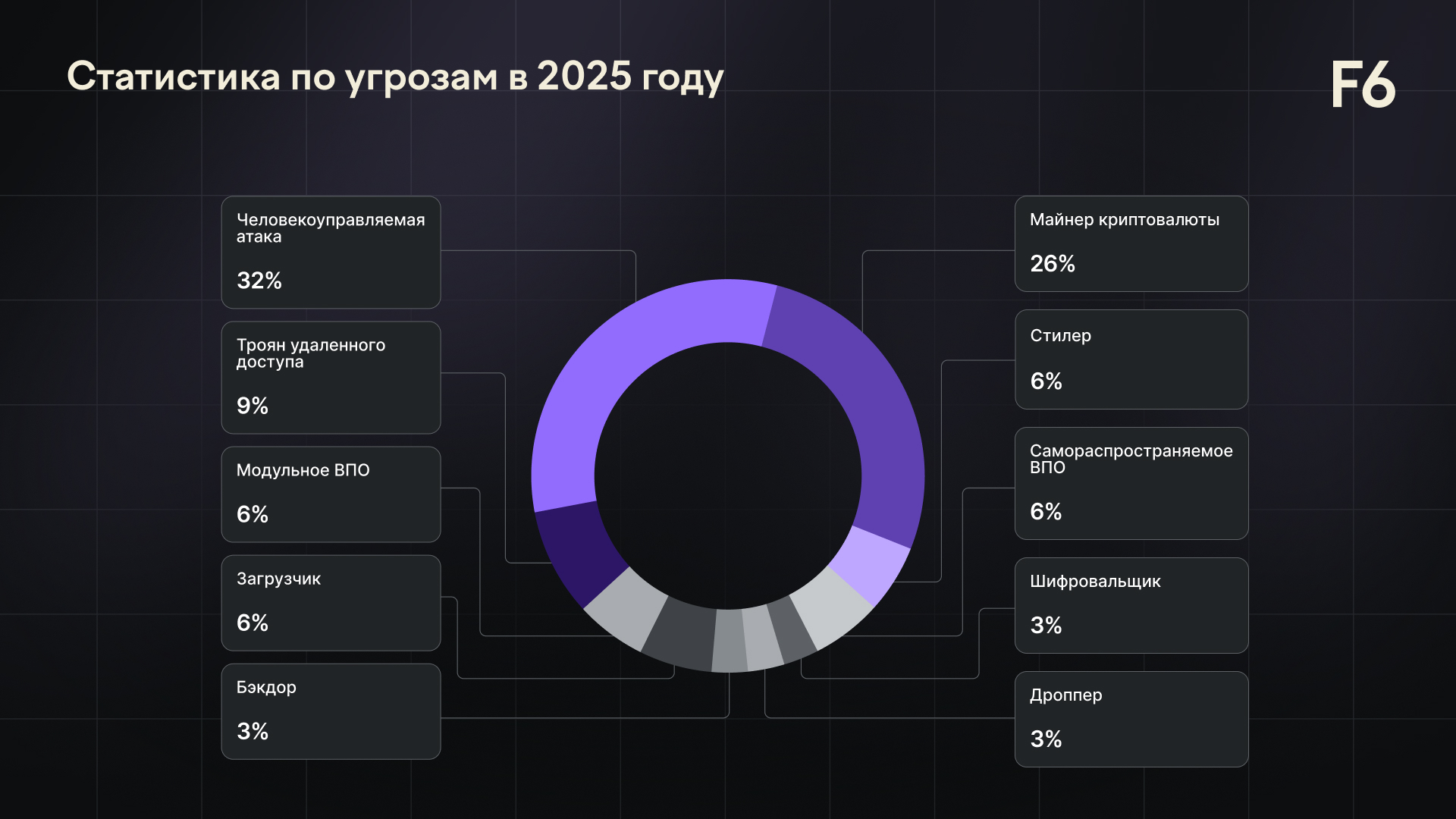 Среди выявленных угроз 2025 года, на которые приходилось реагировать специалистам Центра кибербезопасности (ЦК) компании F6, чаще всего встречались инциденты, связанные с управляемыми человеком атаками — 32%. На втором месте — майнеры (26%). На третьем месте идут инциденты, связанные с использованием троянов удаленного доступа (9%).