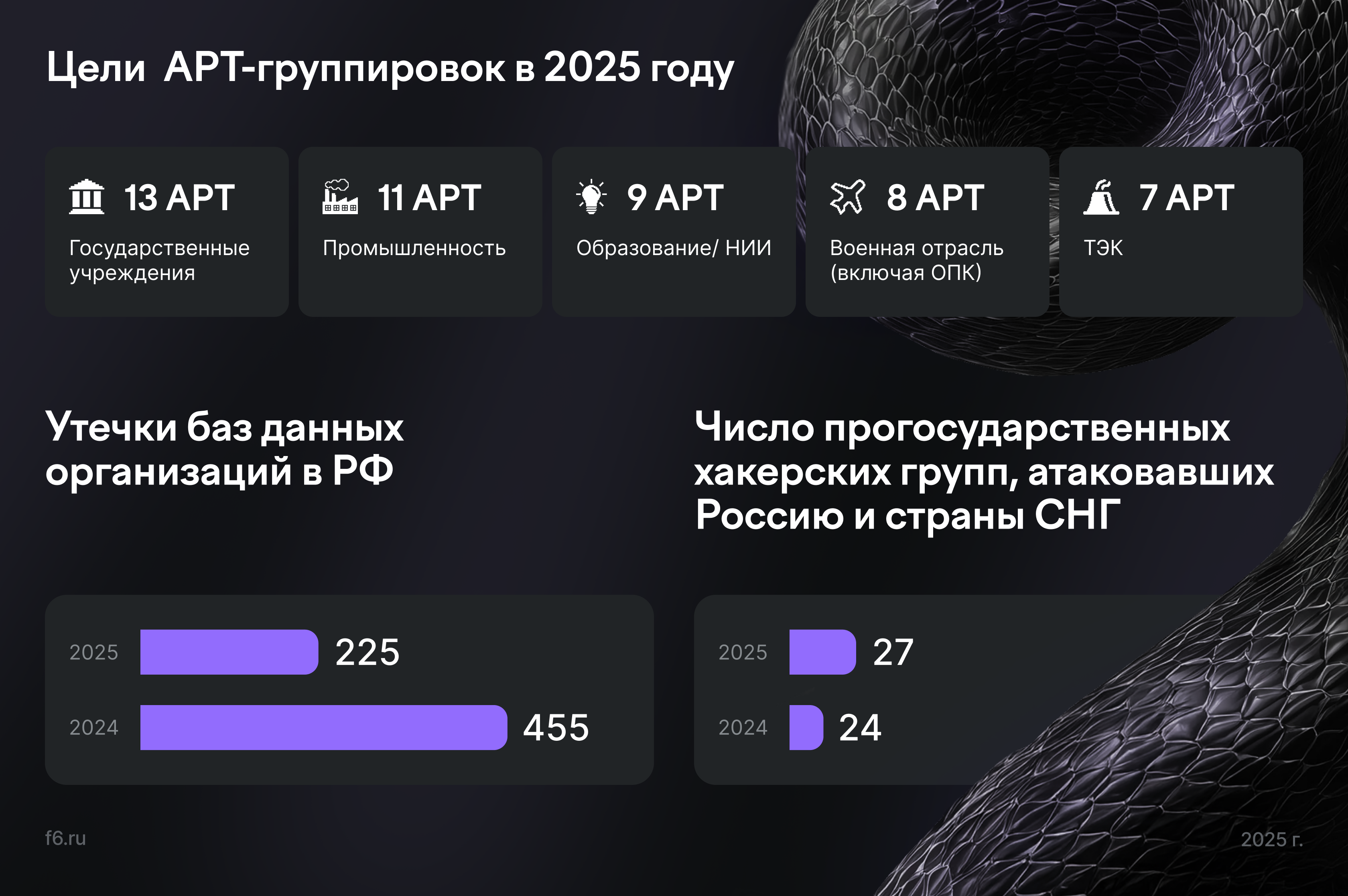 Среди топ-5 индустрий, на которые были нацелены прогосударственные группы в 2025 году, оказались гос. учреждения (их атаковали 13 групп), промышленность (11 групп), НИИ (9 групп), предприятия ВПК (8 групп), ТЭК (7 групп). Аналитики F6 также фиксируют повышенный интерес злоумышленников к IT-компаниям, которые могут использоваться как плацдарм для атак на их клиентов.