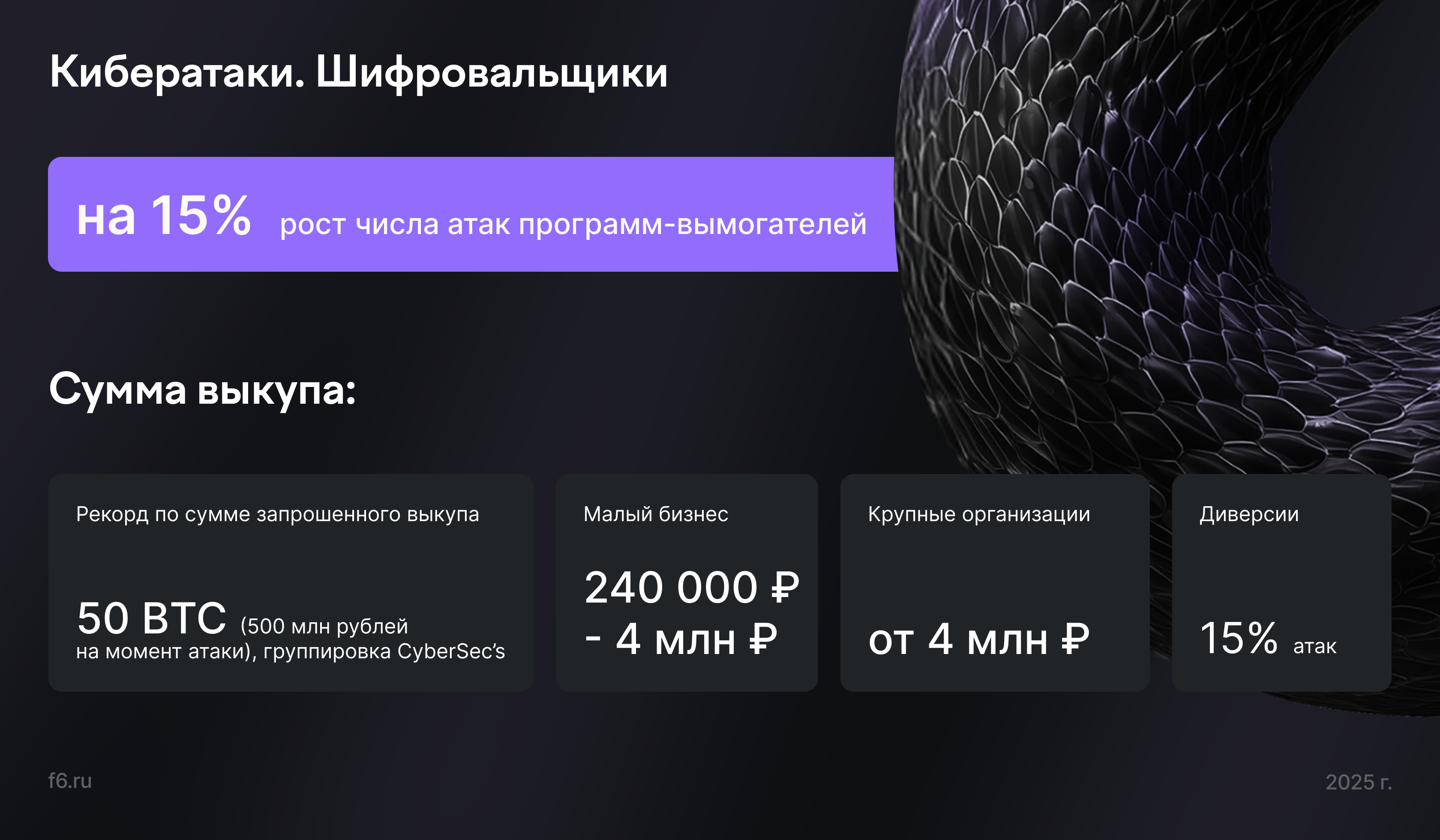 По данным экспертов Лаборатории цифровой криминалистики F6, в 2025 году количество атак программ-вымогателей выросло на 15% (прошлый год рост количества атак — 44%) по сравнению с предыдущим годом. При этом в 15% подобных инцидентов, связанных со средними и крупными предприятиями, целью киберпреступников был не выкуп, а диверсия — разрушение инфраструктуры и нанесение максимального ущерба жертве (в прошлом году на подобные атаки приходилось 10%).
