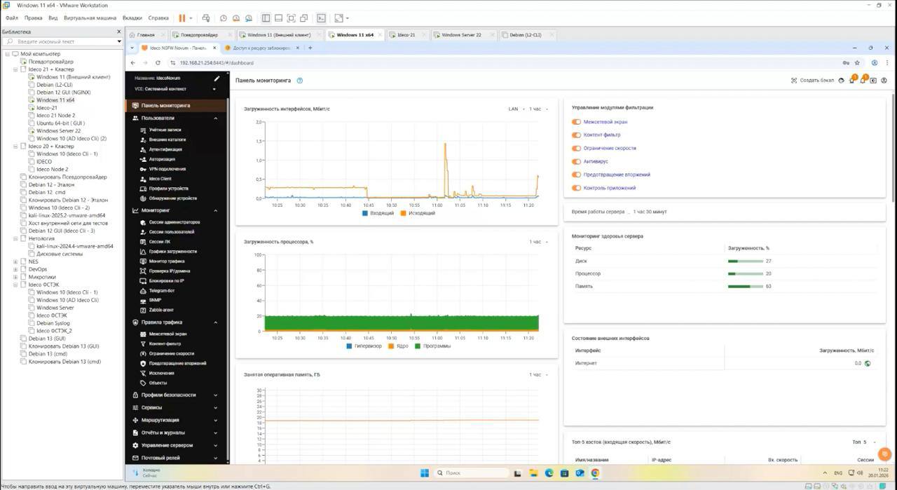 Для организации безопасного удаленного доступа продукт поддерживает как стандартные протоколы вроде IPsec с поддержкой ГОСТ VPN для site-to-site соединений и функцией резервирования каналов, так и фирменный Ideco-клиент, использующий TLS. VPN-клиент доступен для всех основных платформ – Linux, Windows, Mac OS и поддерживает гибкие профили Split Tunneling. Этот клиент обеспечивает VPN-подключение и выполняет проверку соответствия (compliance) конечного устройства, анализируя версию ОС, наличие антивируса и обновлений. Это создает дополнительный уровень защиты в логике Zero Trust Network Access (ZTNA), предотвращая подключения с не соответствующих корпоративной политике устройств даже при компрометации учетных данных. Политики доступа в ZTNA могут привязываться к конкретным сессиям пользователей, их ролям и данным из служб каталогов.