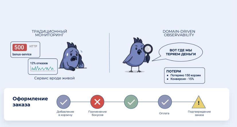 Типичная ситуация: бьет тревога, но тот или иной сервис продолжает работать. Инженерная служба оценивает это так: «Порог не превышен, можно не трогать». Но если посмотреть на происходящее глазами бизнеса, то видно другое, а именно – потери. Клиент не дошел до корзины, и конверсия упала на 15%. Заказчик хотел применить бонусы, но не смог, в итоге ушел с онлайн-площадки. Все это для коммерческого отдела уже не просто баг, а реально упущенная выгода.