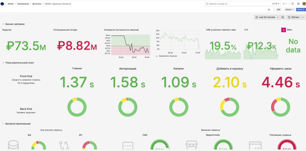 Один из дашбордов платформы – «Здоровье бизнеса». Агенты устанавливаются на тот или иной уровень (Front End, Back End, инфраструктуру, мобильное приложение, закрытую «коробку», например «1С»). Слева – ключевые показатели выручки, потери, график конверсии и другие важные для бизнеса метрики, которые соотносятся с временным интервалом. В ходе демонстрации были показаны метрики, выбранные за 30 минут, последний час.