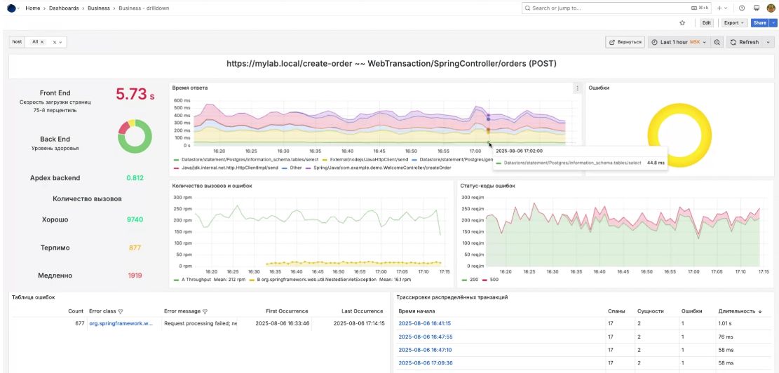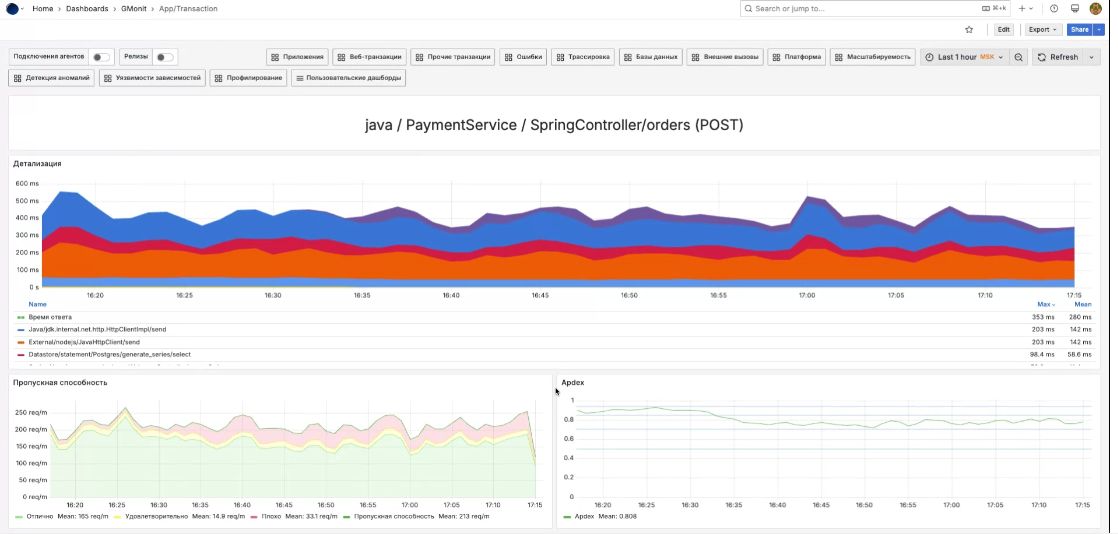 На уровне сервиса видны транзакция платежного сервиса, который написан на Java, и ее компоненты. С упомянутой точки 16.32 наметилась тенденция к росту продолжительности обработки запросов. Исходный показатель Apdex – своего рода градусник здоровья приложения, на которое по умолчанию устанавливается агент, – подтверждает, что сервис начинает давать сбои.